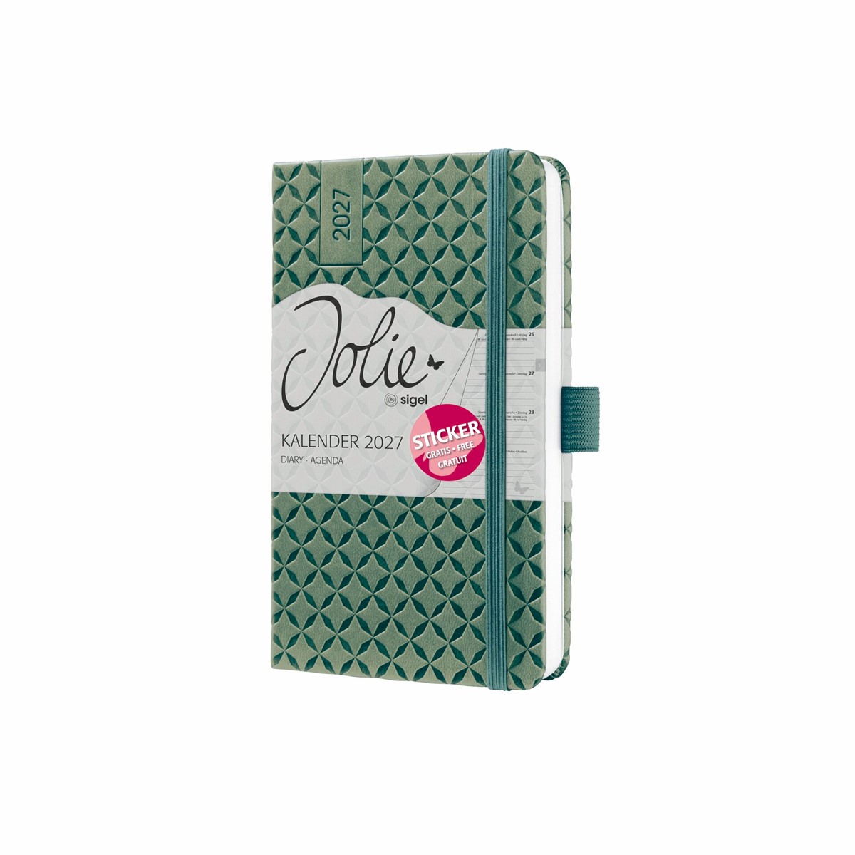 Immer stylisch organisiert - mit dem angesagten Jolie Wochenkalender für 2027 (Kalendarium: 2 Seiten = 1 Woche, DE/GB/FR/NL) im Format ca. A6 (9,50 x 15 x 1,60 cm) mit 174 Seiten (davon 12 Blätter perforiert). Der stabile Hardcover-Einband in grün garantiert Stabilität beim Schreiben.