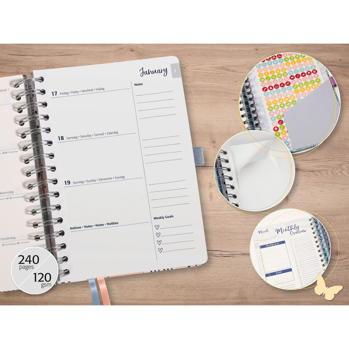 Wochenkalendarium mit Monats- und Jahresübersichten, zahlreiche Bullet Journal Seiten mit Planungsteil für jeden Monat (nur EN), zusätzliche Infoseiten wie Ferien und Feiertage (DE/AT/CH/UK/FR/BE/NL)