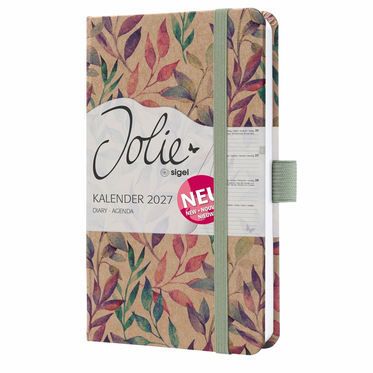 Immer stylisch organisiert - mit dem angesagten Jolie Wochenkalender "Fairy Leaves" für 2027 (Kalendarium: 2 Seiten = 1 Woche, DE/EN/FR/NL) im Format ca. A6 (9,50 x 15 x 1,60 cm) mit 174 Seiten (davon 12 Blätter perforiert). Der stabile Hardcover-Einband in braun/pink/lila/türkis garantiert Stabilität beim Schreiben.