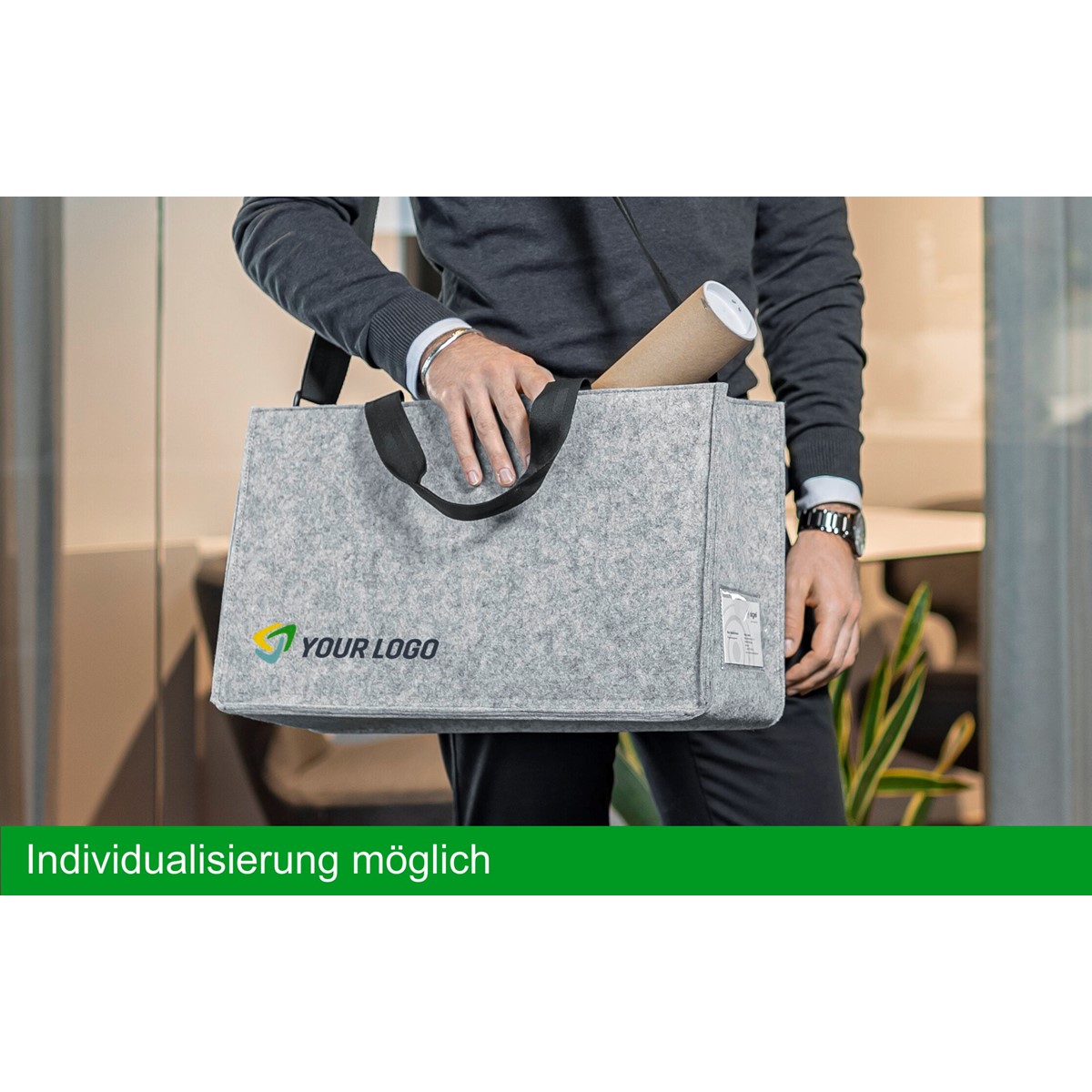 Stabil & standfest: Hochwertige Desk Sharing Bag Classic L mit den Maßen 50 x 28 x 15 cm (B x H x T) für Laptops bis zu 17,3 Zoll. Aus Filz synthetisch hergestellt aus 100% recyceltem PET, in hellgrau mit farblich passenden Ziernähten. Möglichkeit zur individuellen Beschriftung. Sehr sicherer Stand mit und ohne Inhalt durch breiten Boden (Belastbarkeit bis zu 15 kg).