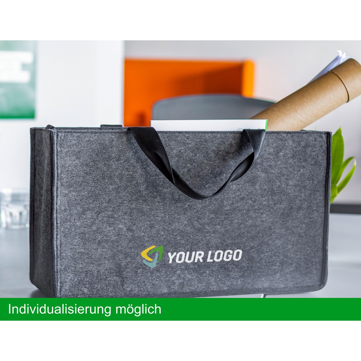 Mobil & praktisch: Leichte Desk Sharing Tasche aus Filz zum Verstauen und Transportieren von Laptop und Büroutensilien. Greifen Sie zu jeder Zeit unabhängig vom Arbeitsort auf Ihre persönlichen Arbeitsmittel zu.