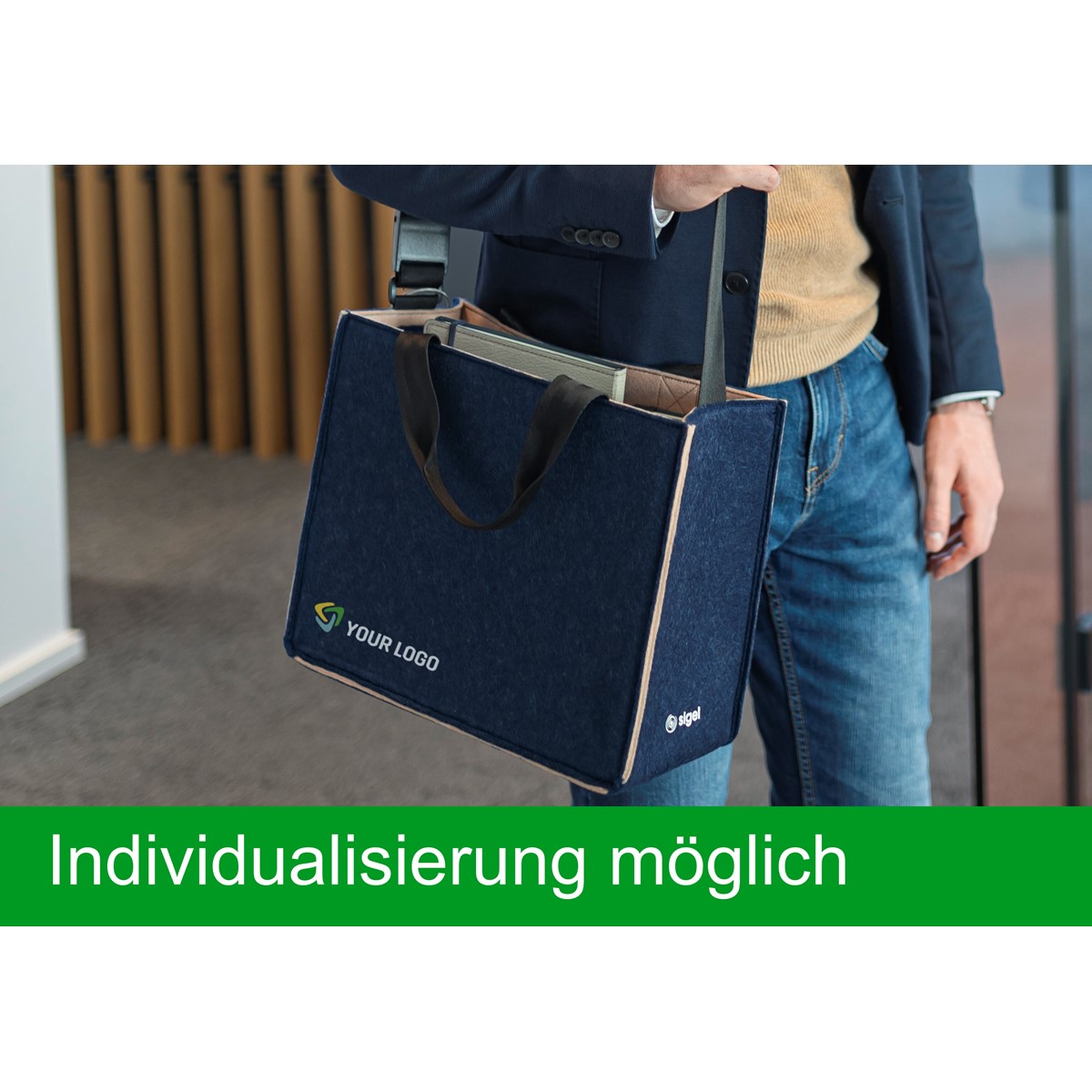 Stabil & standfest: Hochwertige Desk Sharing Bag Bicolor M mit den Maßen 36 x 28 x 15 cm (B x H x T) für Laptops bis zu 15,4 Zoll. Aus Filz synthetisch hergestellt aus 100% recyceltem PET, in dunkelblau/beige mit farblich passenden Ziernähten. Möglichkeit zur individuellen Beschriftung. Sehr sicherer Stand mit und ohne Inhalt durch breiten Boden (Belastbarkeit bis zu 15 kg).