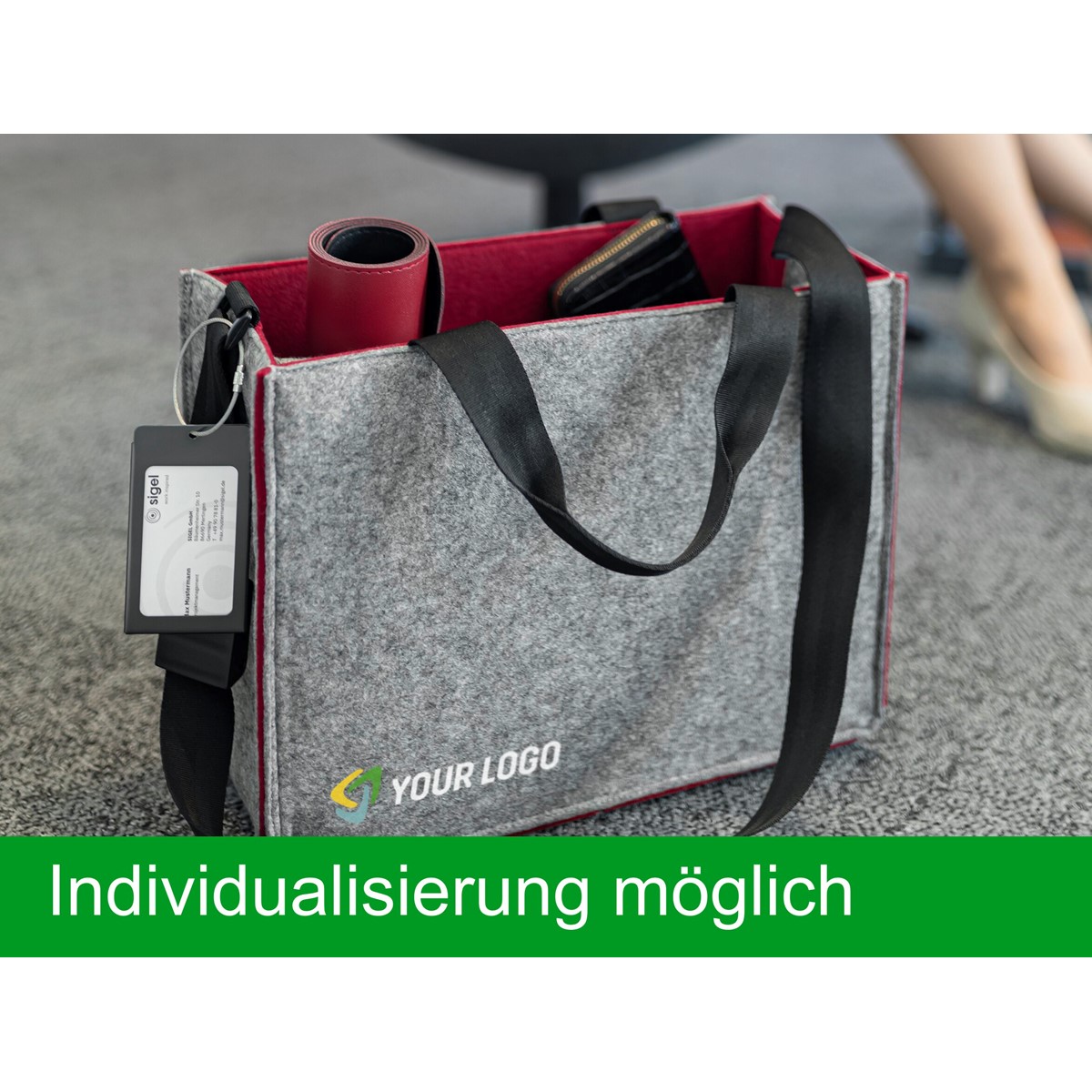 Stabil & standfest: Hochwertige Desk Sharing Bag Bicolor M mit den Maßen 36 x 28 x 15 cm (B x H x T) für Laptops bis zu 15,4 Zoll. Aus Filz synthetisch hergestellt aus 100% recyceltem PET, in grau/dunkelrot mit farblich passenden Ziernähten. Möglichkeit zur individuellen Beschriftung. Sehr sicherer Stand mit und ohne Inhalt durch breiten Boden (Belastbarkeit bis zu 15 kg).
