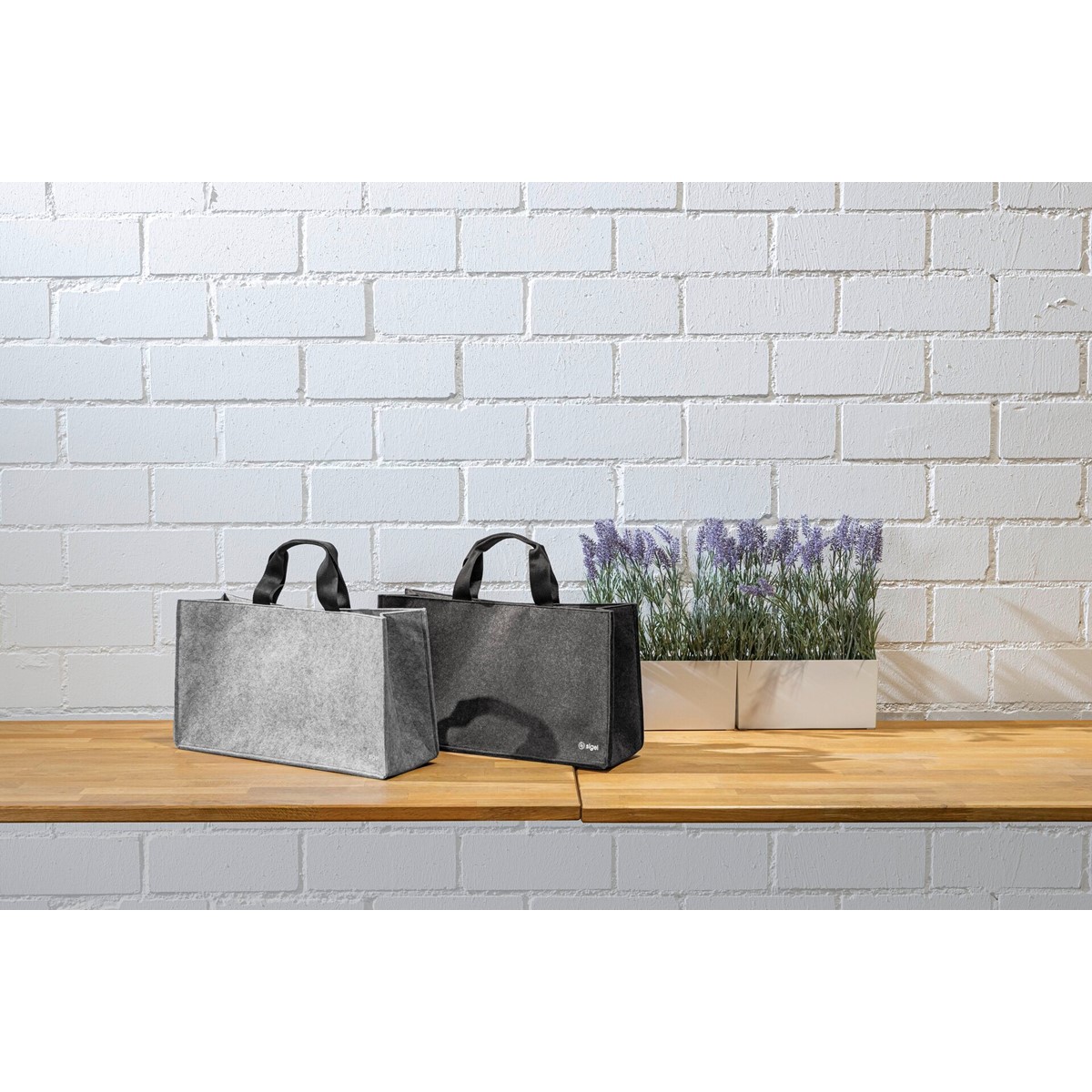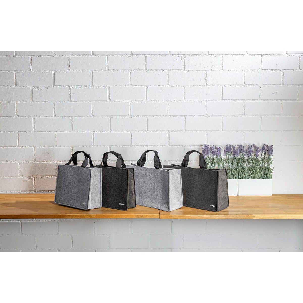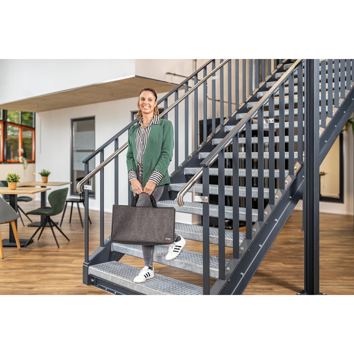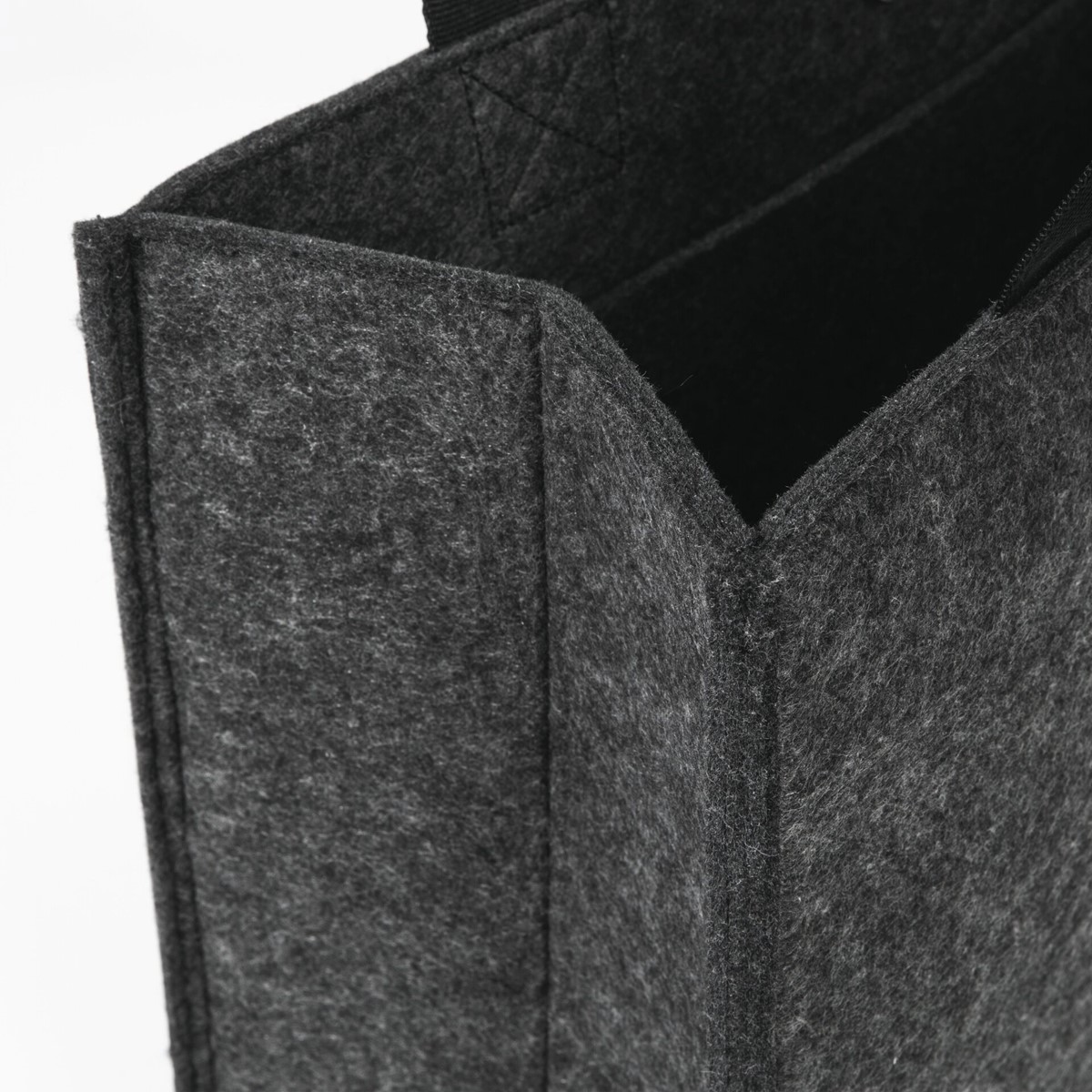 Hochwertige Desk Sharing Bag Basic L mit den Maßen 50 x 28 x 15 cm (B x H x T) für Laptops bis zu 17,3 Zoll. Aus Filz synthetisch hergestellt aus 100% recyceltem PET, in dunkelgrau mit grauen Ziernähten. Möglichkeit zur individuellen Beschriftung. Sicherer Stand mit Inhalt (Belastbarkeit bis zu 12 kg) und flach faltbar bei Nichtgebrauch.