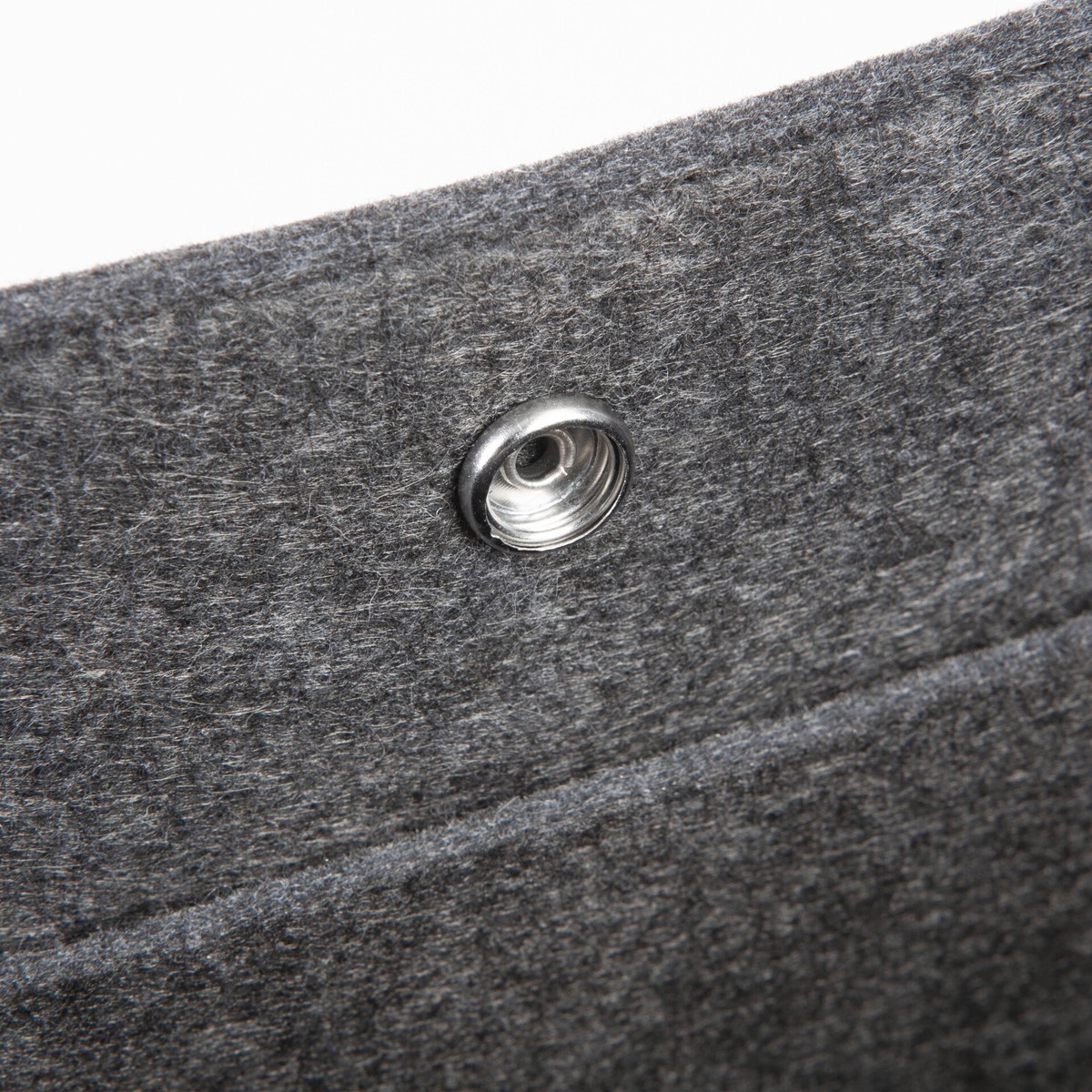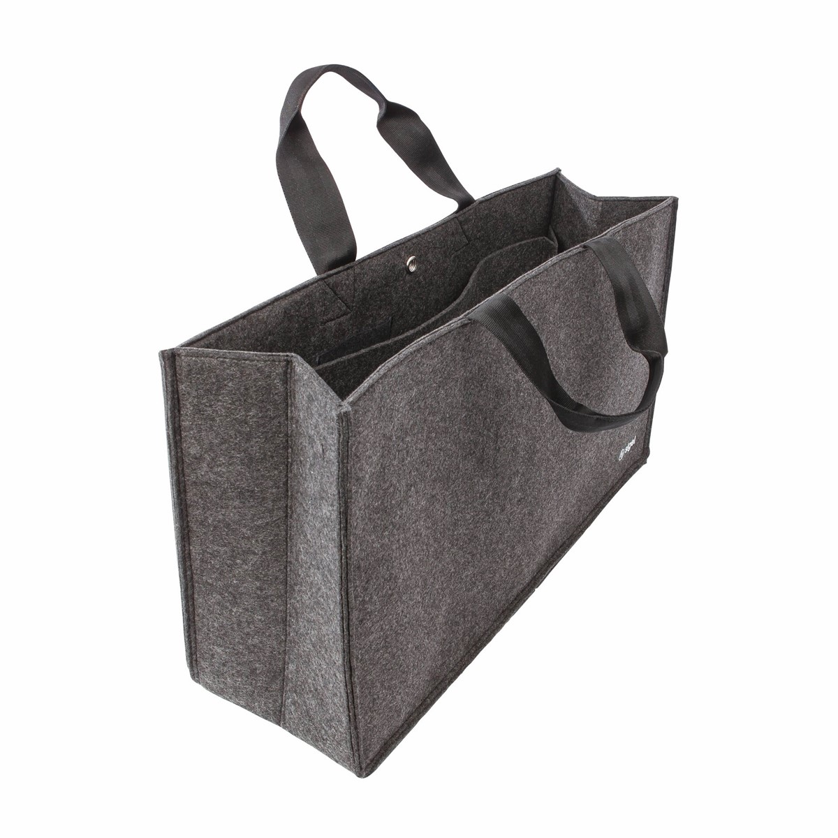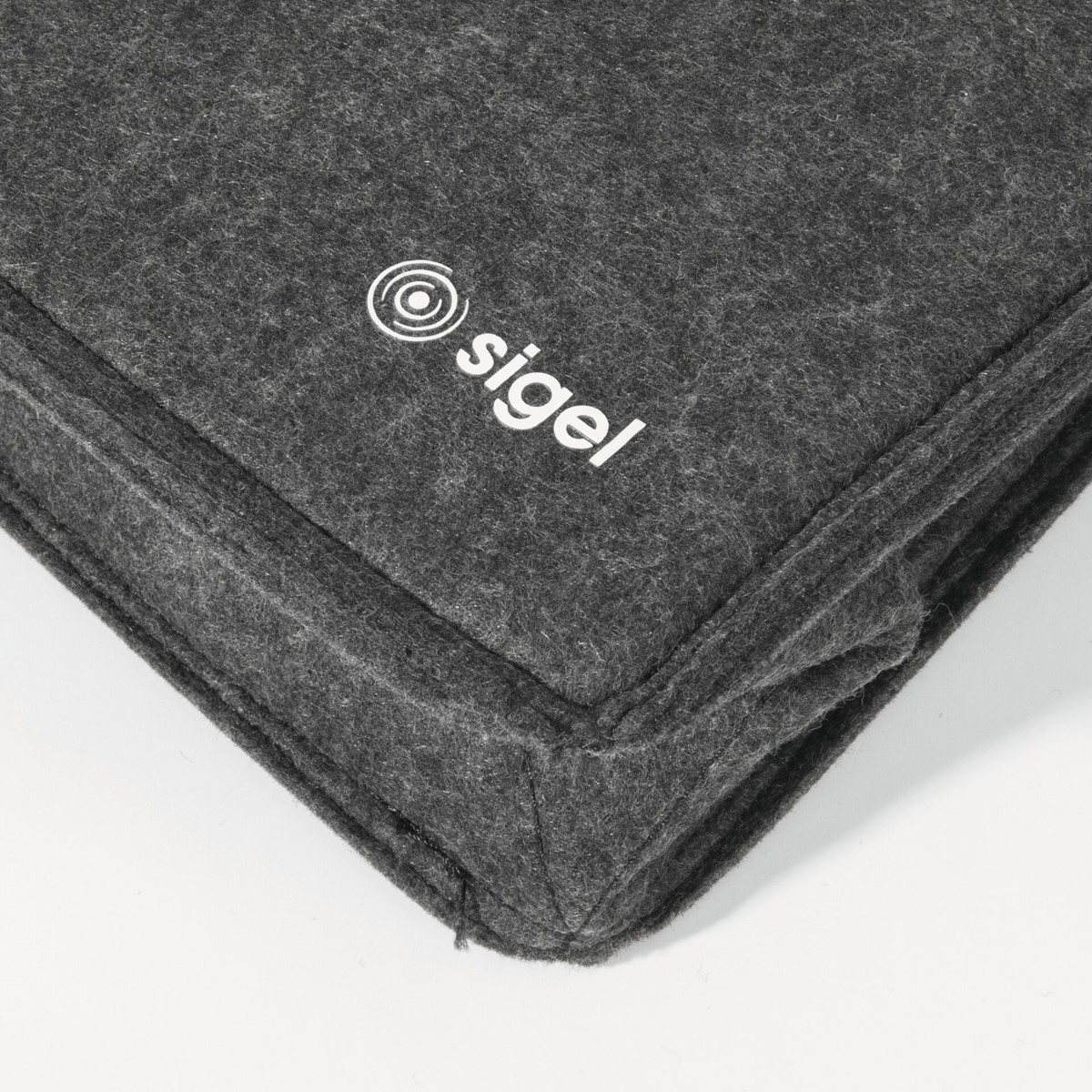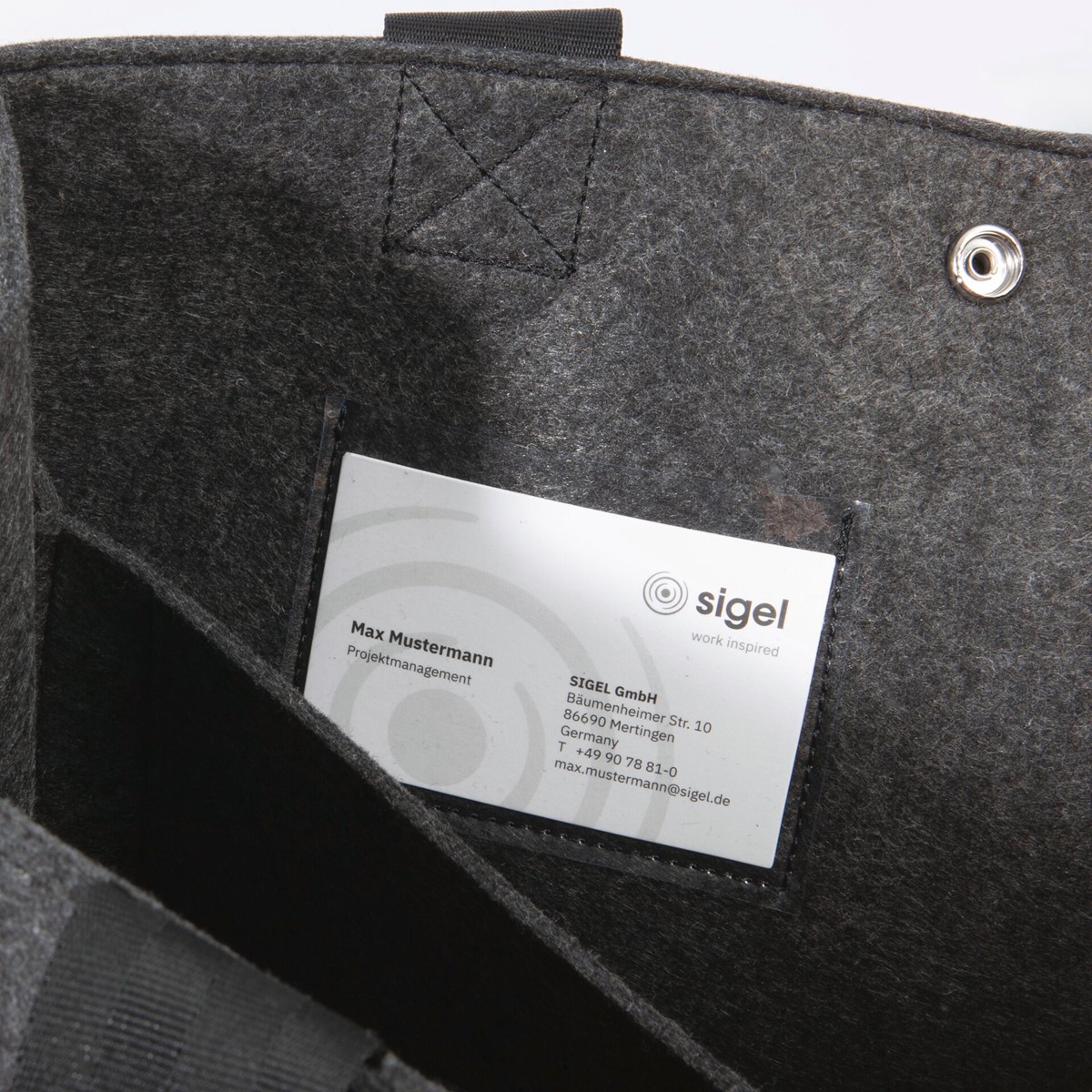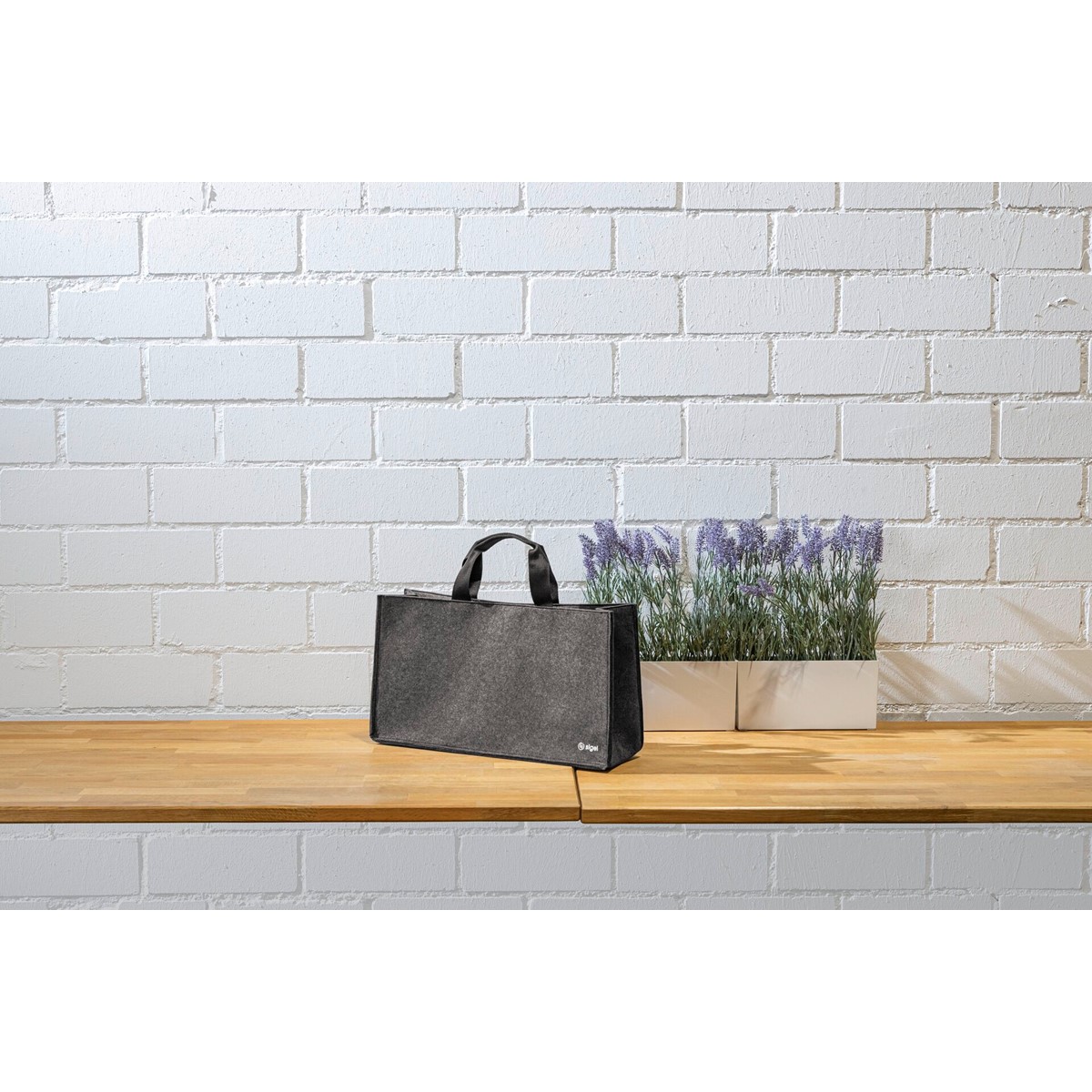 Hochwertige Desk Sharing Bag Basic L mit den Maßen 50 x 28 x 15 cm (B x H x T) für Laptops bis zu 17,3 Zoll. Aus Filz synthetisch hergestellt aus 100% recyceltem PET, in dunkelgrau mit grauen Ziernähten. Möglichkeit zur individuellen Beschriftung. Sicherer Stand mit Inhalt (Belastbarkeit bis zu 12 kg) und flach faltbar bei Nichtgebrauch.