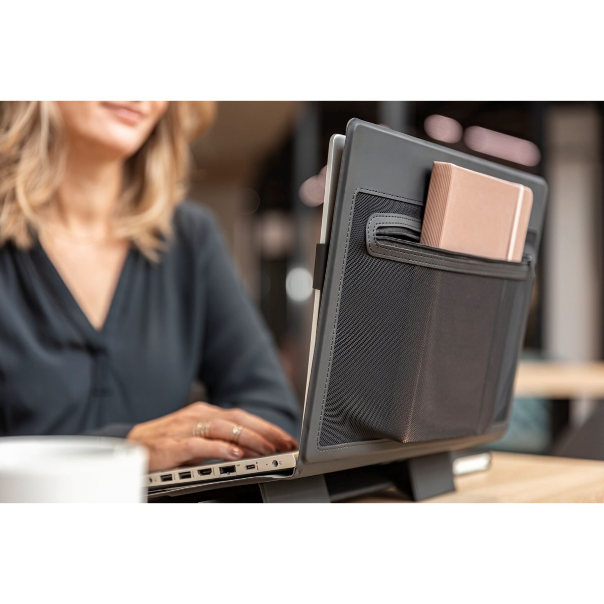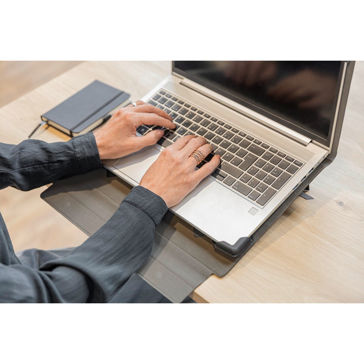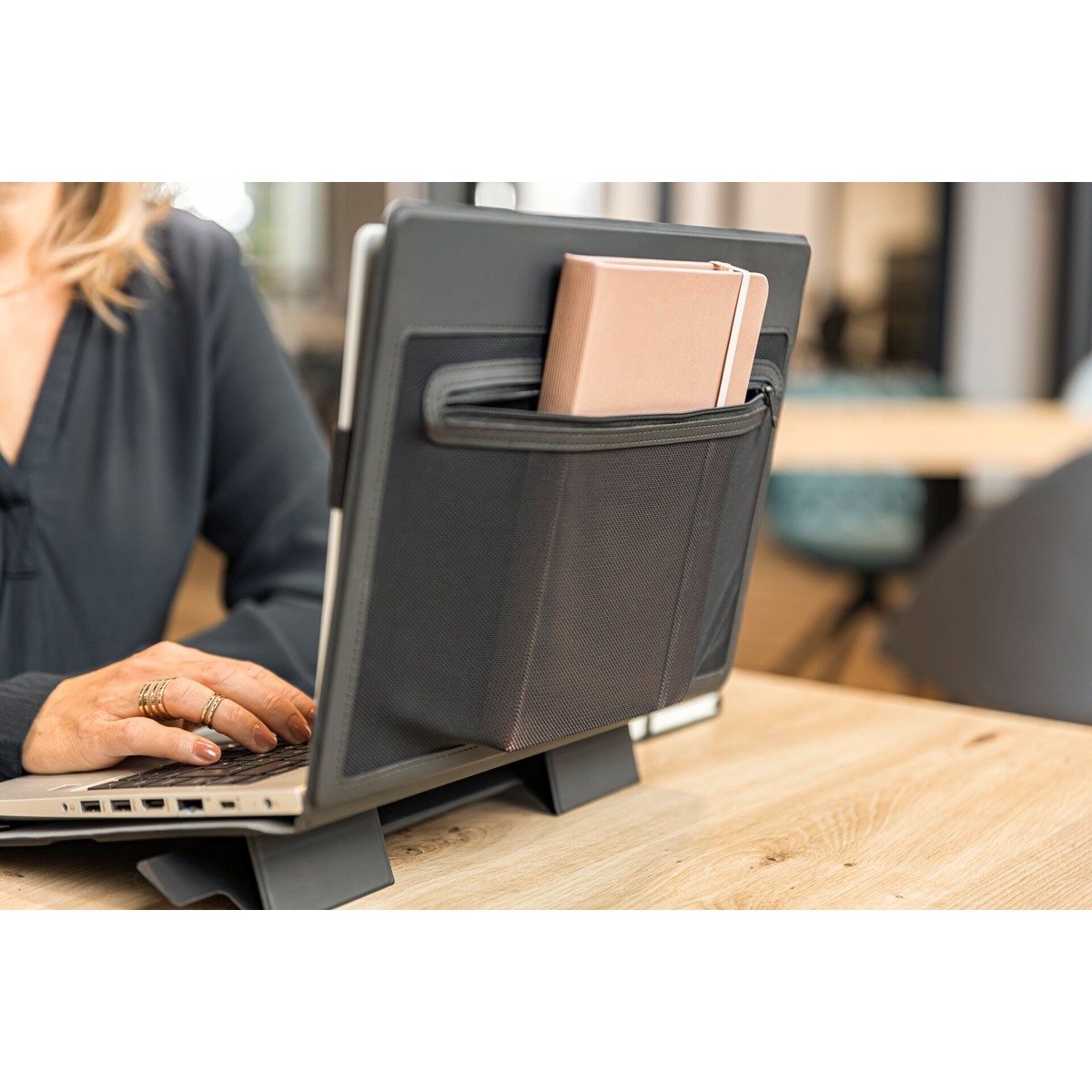 Einfach aufstellen und loslegen: am Schreibtisch im Büro oder Homeoffice, im Meetingraum, unterwegs im Zug oder wo immer Sie mobil arbeiten möchten. Nach Benutzung verschließt eine Klappe mit verdecktem Magnetverschluss das Case zuverlässig.