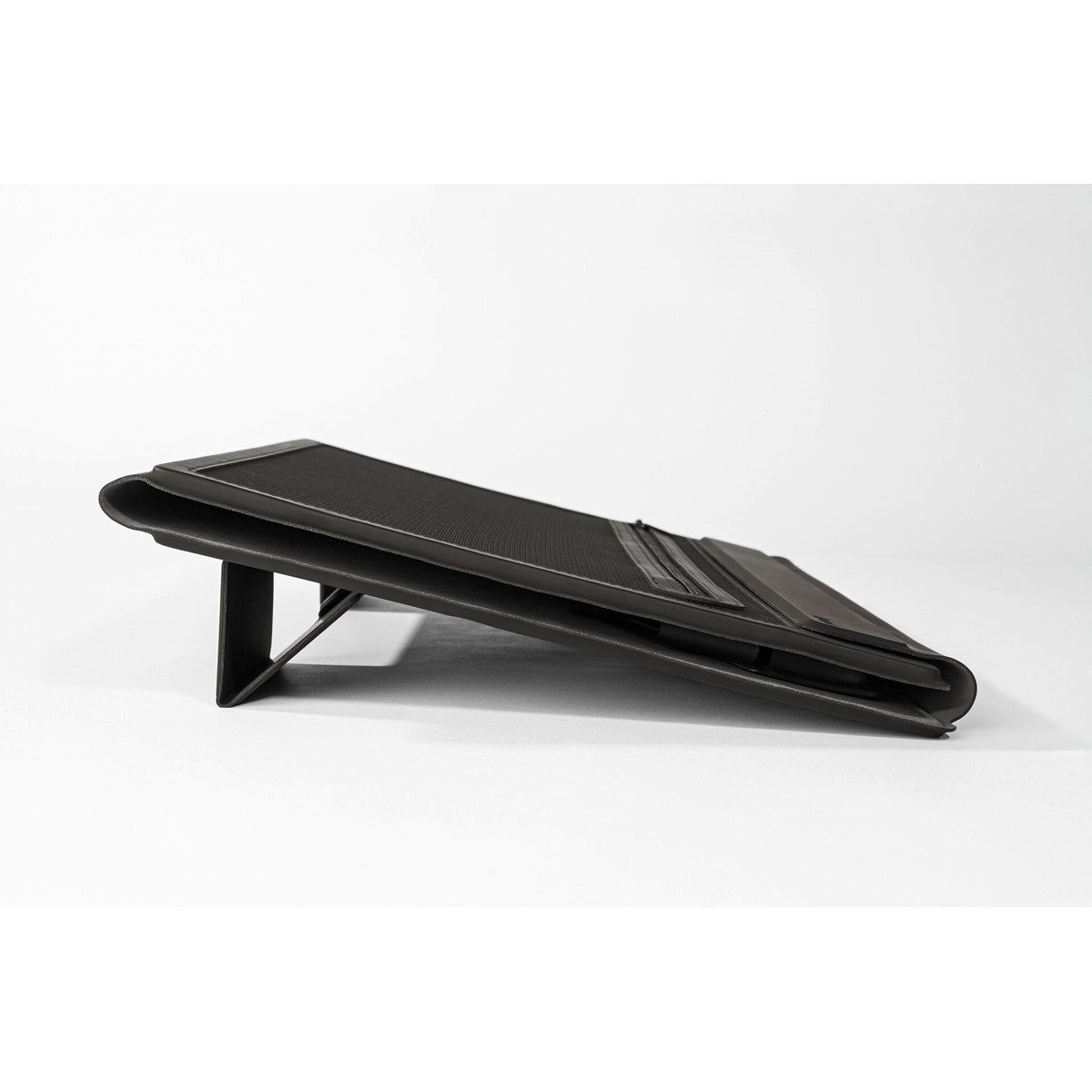 Die obere Klappe des Cases lässt sich mit dem eingespannten Laptop-Bildschirm stufenlos verstellen. Auf der unteren Rückseite ermöglicht ein magnetischer Aufstellmechanismus ergonomisches Arbeiten.