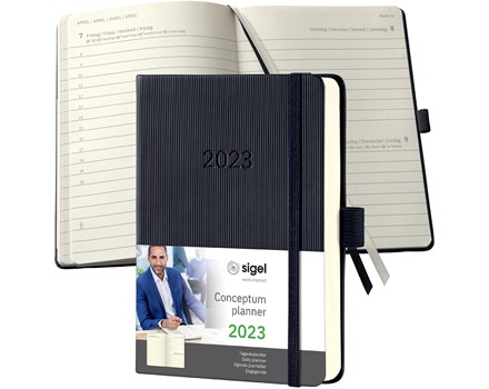 Immer stilsicher organisiert - mit dem eleganten Tageskalender Conceptum für 2023 (Kalendarium: 1 Seite = 1 Tag, DE/GB/FR/NL) im Format ca. A6 (10,8 x 15,1 cm) mit 400 Seiten (davon 18 Blätter perforiert). Der stabile Hardcover-Einband in schwarz garantiert Stabilität beim Schreiben.