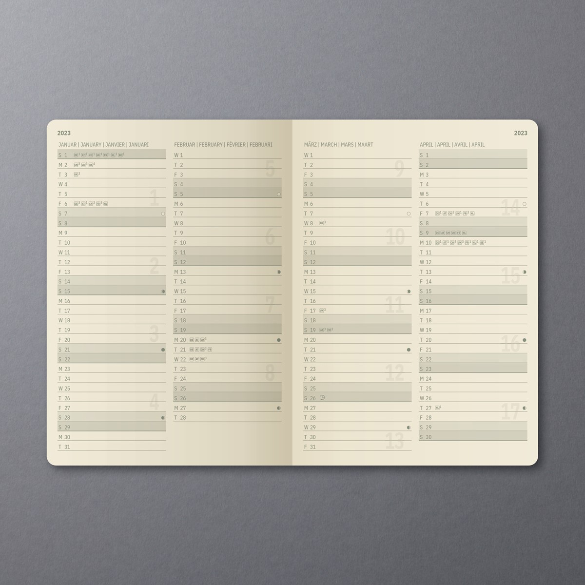 Entdecken Sie den besten Kalender, der Sie je durchs Jahr begleitet hat. Immer stilsicher organisiert - mit dem eleganten Wochenkalender Conceptum für 2023 (Kalendarium: 2 Seiten = 1 Woche, DE/GB/FR/NL) im Format ca. A5 (14,8 x 21,3 cm) mit 192 Seiten (davon 18 Blätter perforiert).