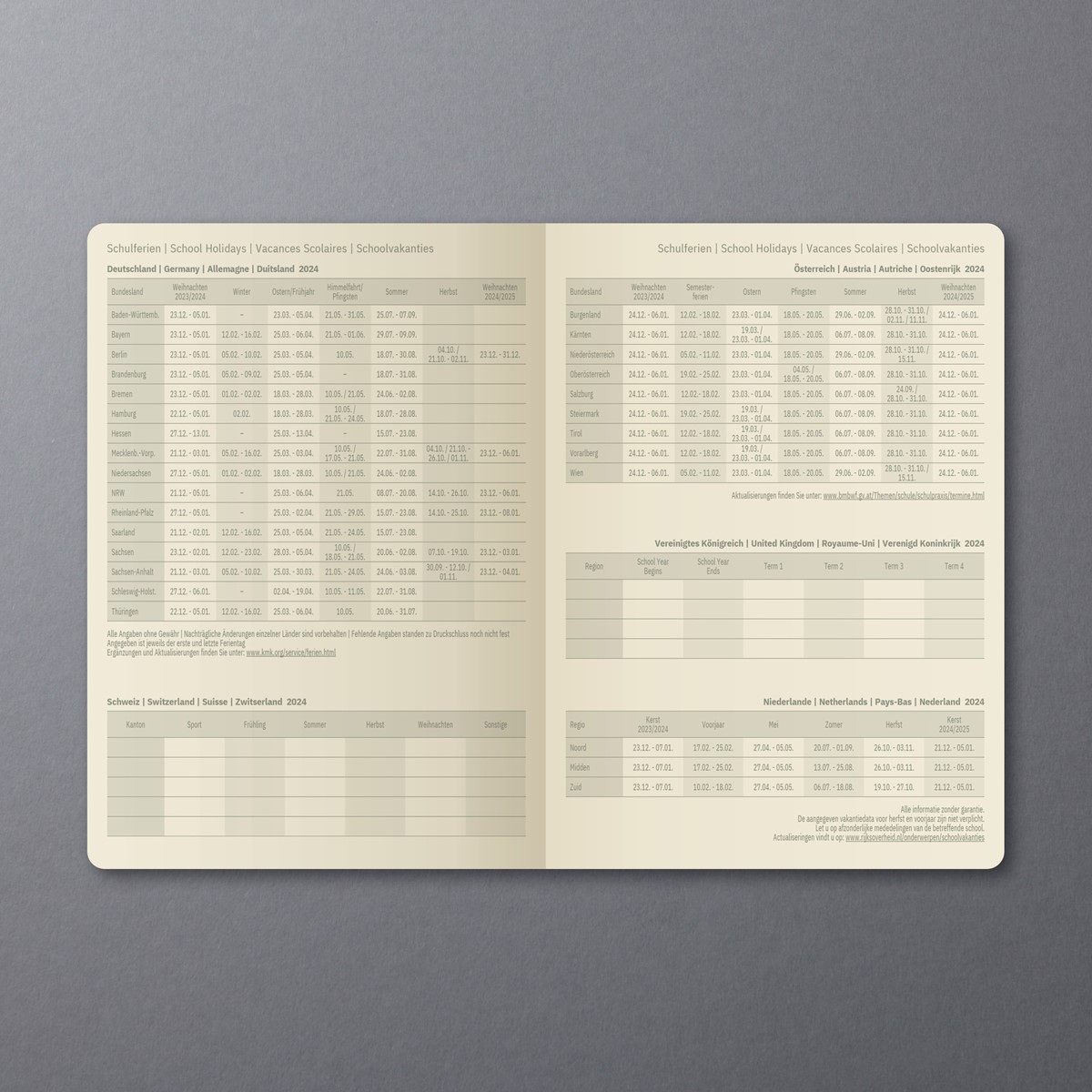 Monats- und Jahresübersichten, Feiertage (DE/AT/CH/UK/FR/BE/NL), Ferienübersichten (DE/AT/CH/NL), Maßeinheiten (EU/UK/US), Zeitzonenkarte