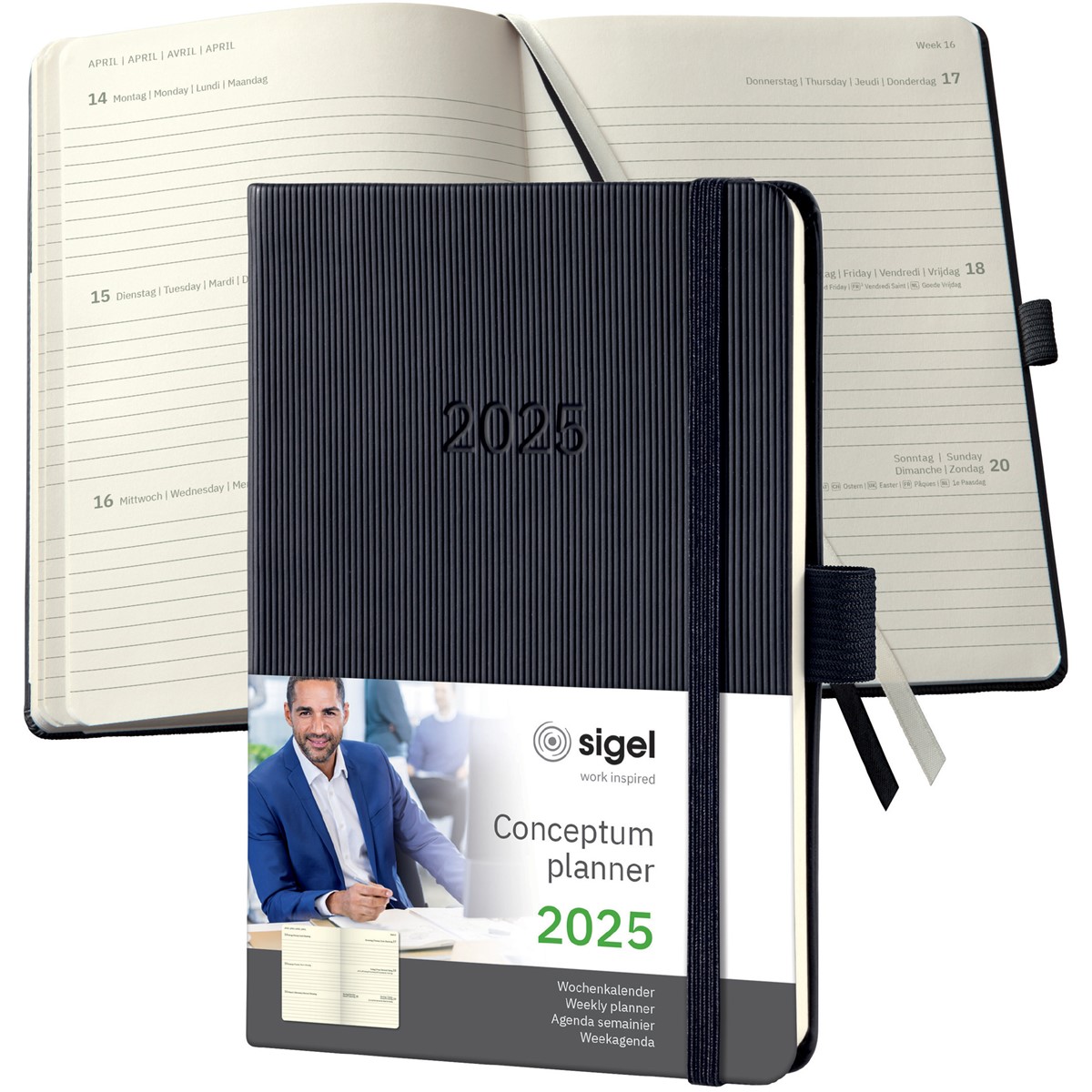 Immer stilsicher organisiert - mit dem eleganten Wochenkalender Conceptum für 2025 (Kalendarium: 2 Seiten = 1 Woche, DE/GB/FR/NL) im Format ca. A6 (10,8 x 15,1 cm) mit 176 Seiten (davon 18 Blätter perforiert). Der stabile **Hardcover-E