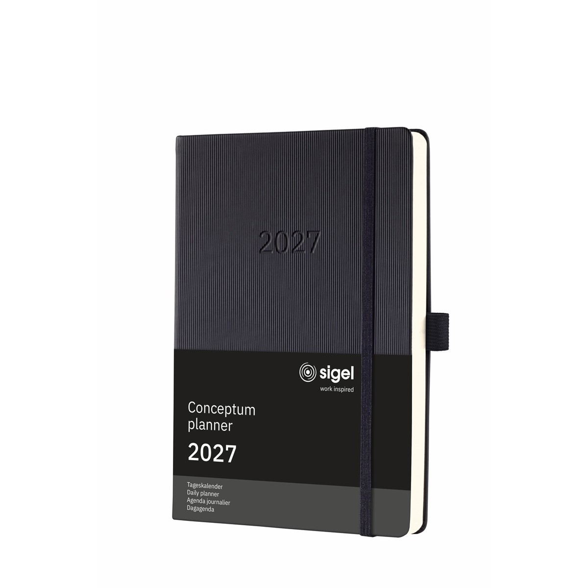 Immer stilsicher organisiert - mit dem eleganten Tageskalender Conceptum für 2027 (Kalendarium: 1 Seite = 1 Tag, DE/GB/FR/NL) im Format ca. A5 (14,80 x 21,30 x 3 cm) mit 400 Seiten (davon 18 Blätter perforiert). Der stabile Hardcover-Einband in schwarz garantiert Stabilität beim Schreiben.