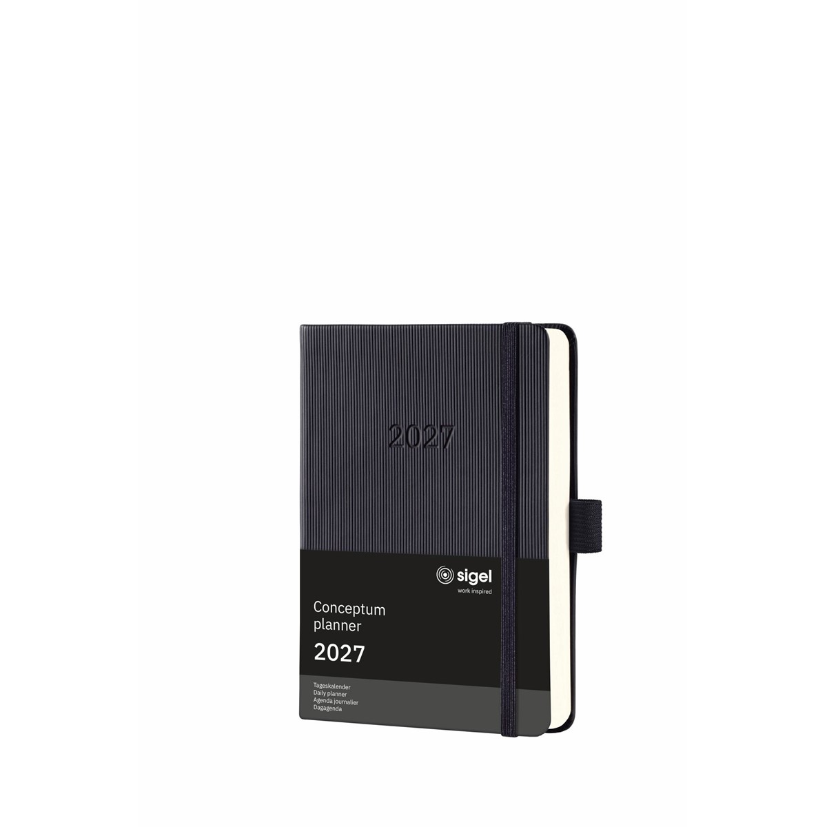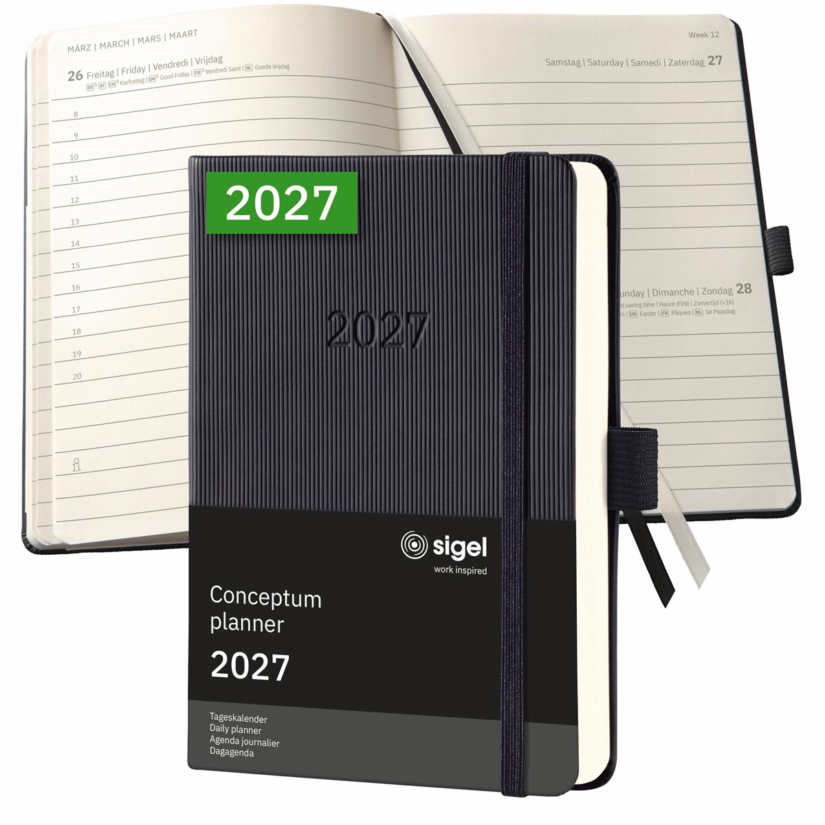 Immer stilsicher organisiert - mit dem eleganten Tageskalender Conceptum für 2027 (Kalendarium: 1 Seite = 1 Tag, DE/GB/FR/NL) im Format ca. A6 (10,80 x 15,10 x 3 cm) mit 400 Seiten (davon 18 Blätter perforiert). Der stabile Hardcover-Einband in schwarz garantiert Stabilität beim Schreiben.