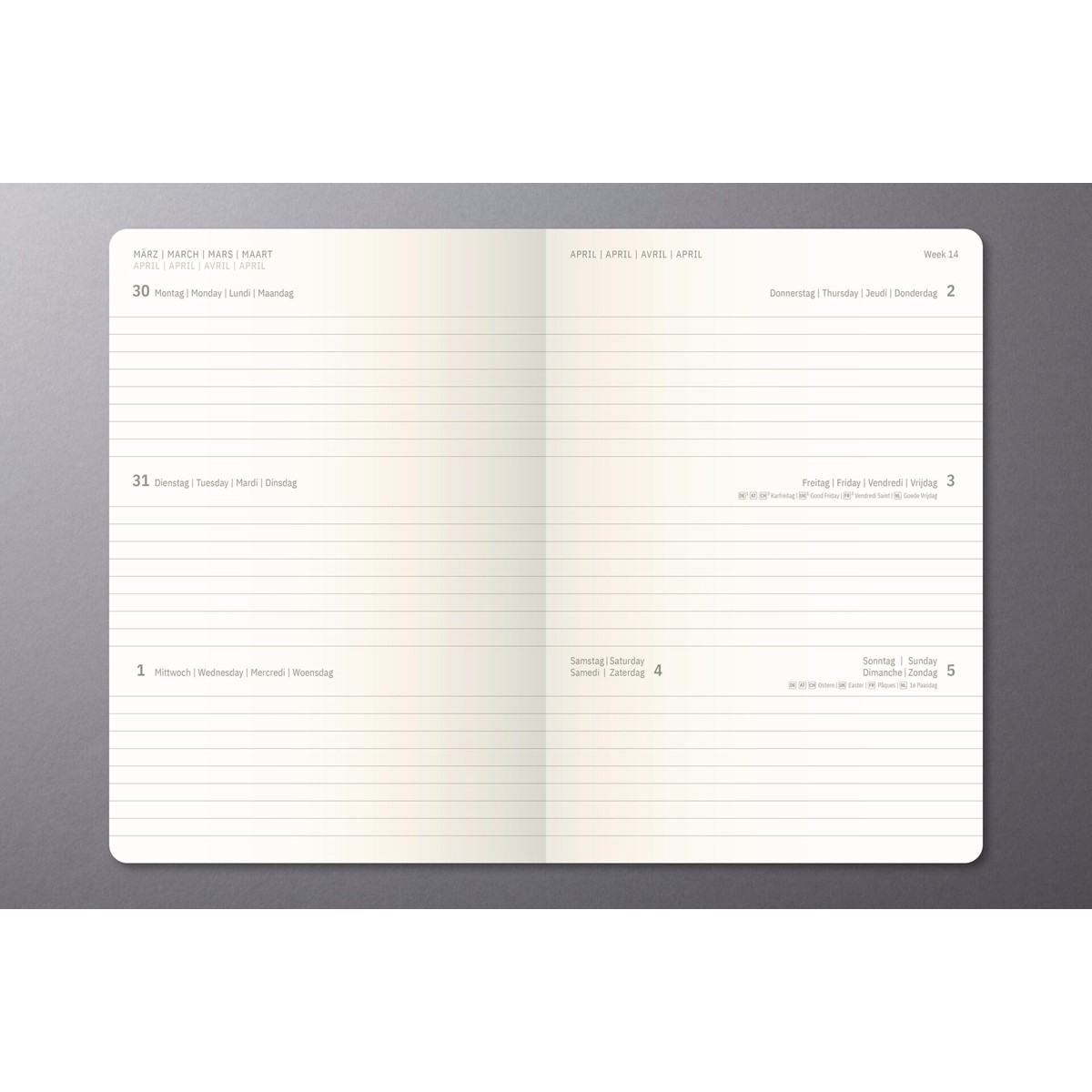 Die Oberfläche mit gerillter Softwave-Struktur sorgt für eine angenehme Haptik und macht den Terminkalender zum eleganten Begleiter.