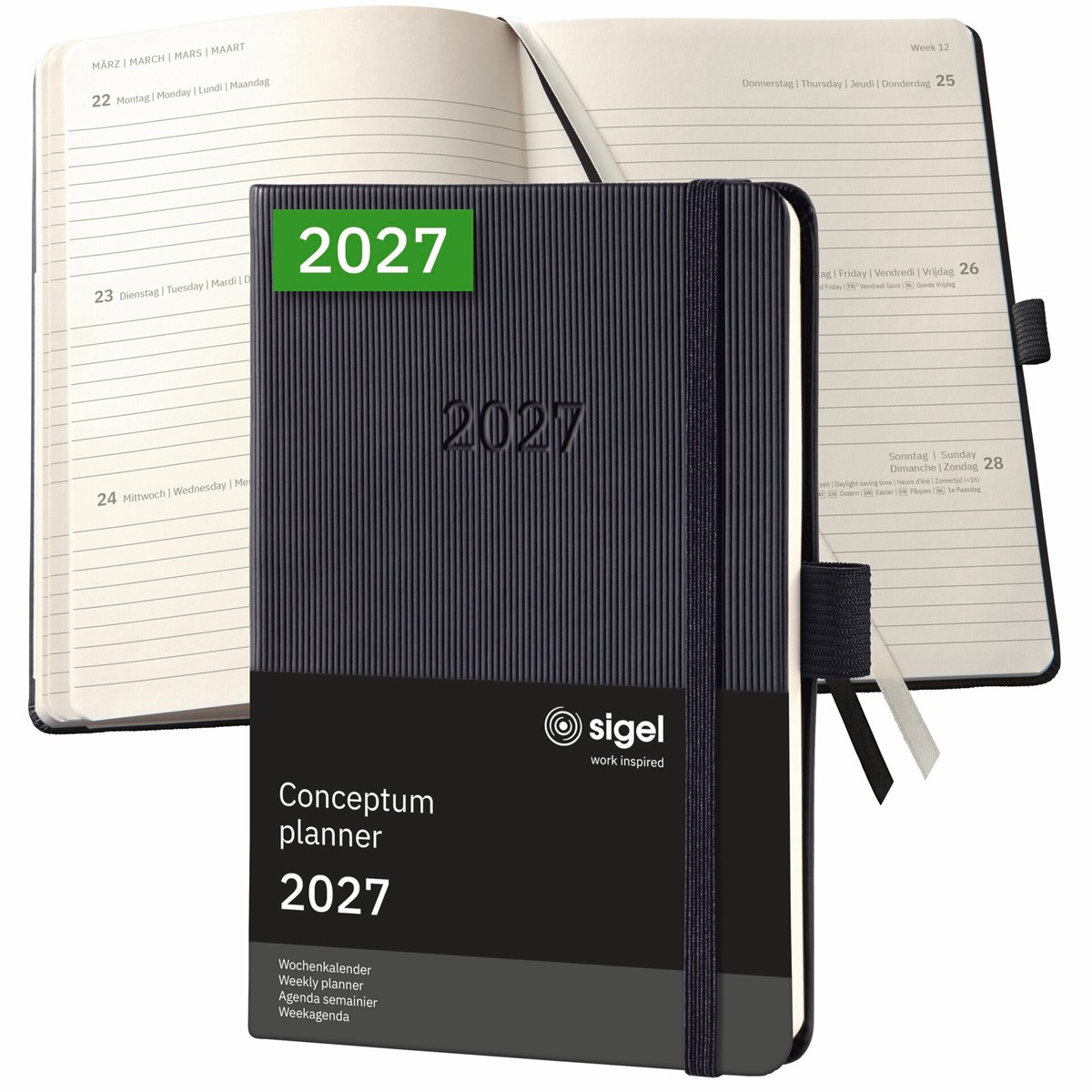 Immer stilsicher organisiert - mit dem eleganten Wochenkalender Conceptum für 2027 (Kalendarium: 2 Seiten = 1 Woche, DE/GB/FR/NL) im Format ca. A6 (10,80 x 15,10 x 2 cm) mit 176 Seiten (davon 18 Blätter perforiert). Der stabile Hardcover-Einband in schwarz garantiert Stabilität beim Schreiben.