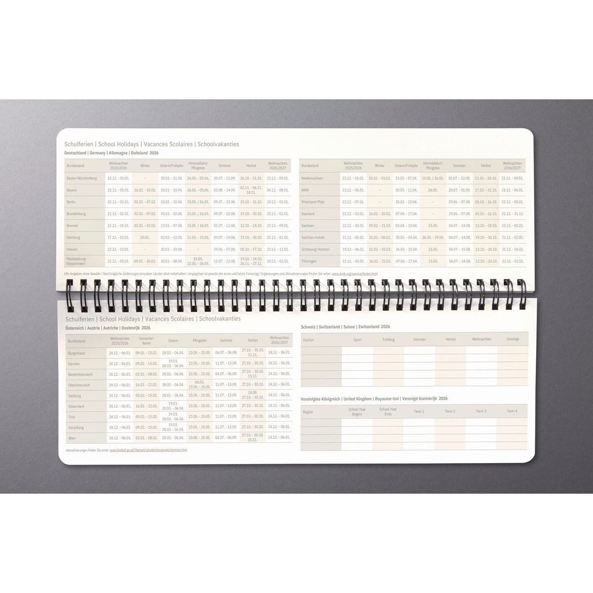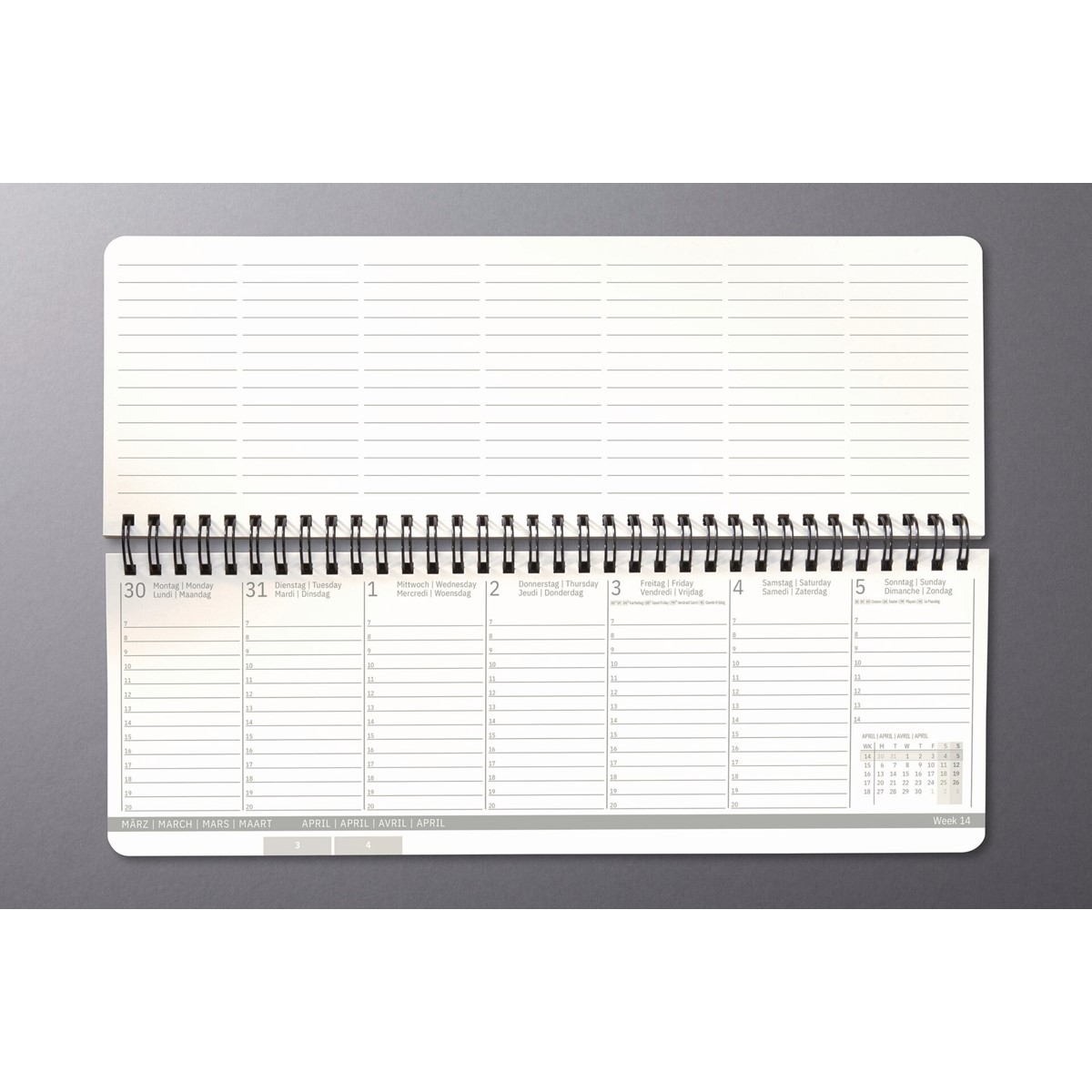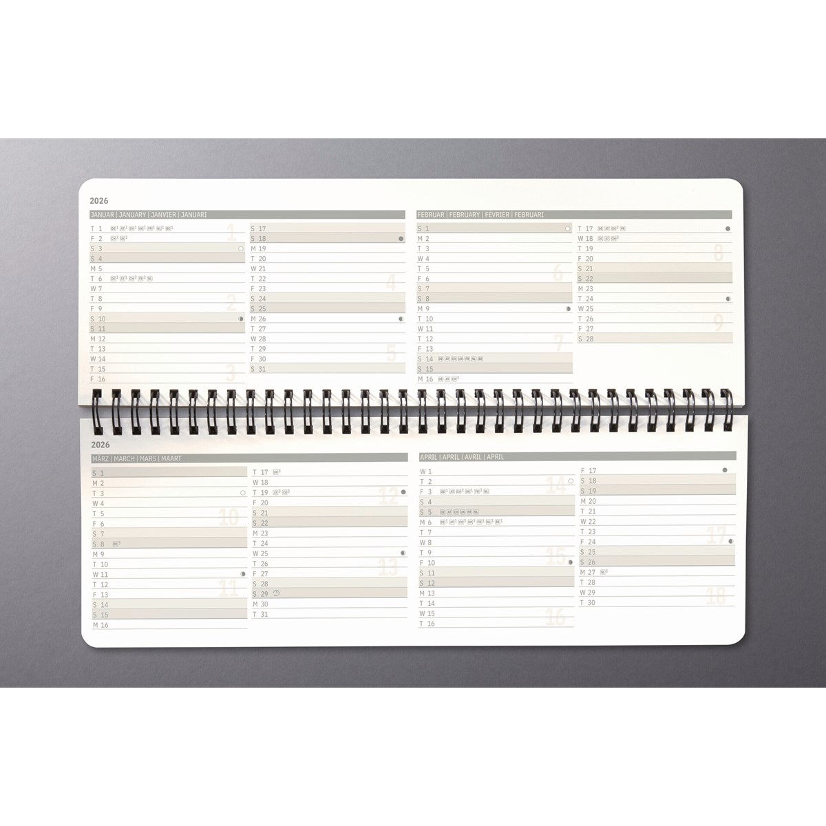 Mit der Ringösenbindung aus Metall lässt sich der Kalender mit seiner praktischen Aufstellfunktion liegend oder stehend einsetzen.