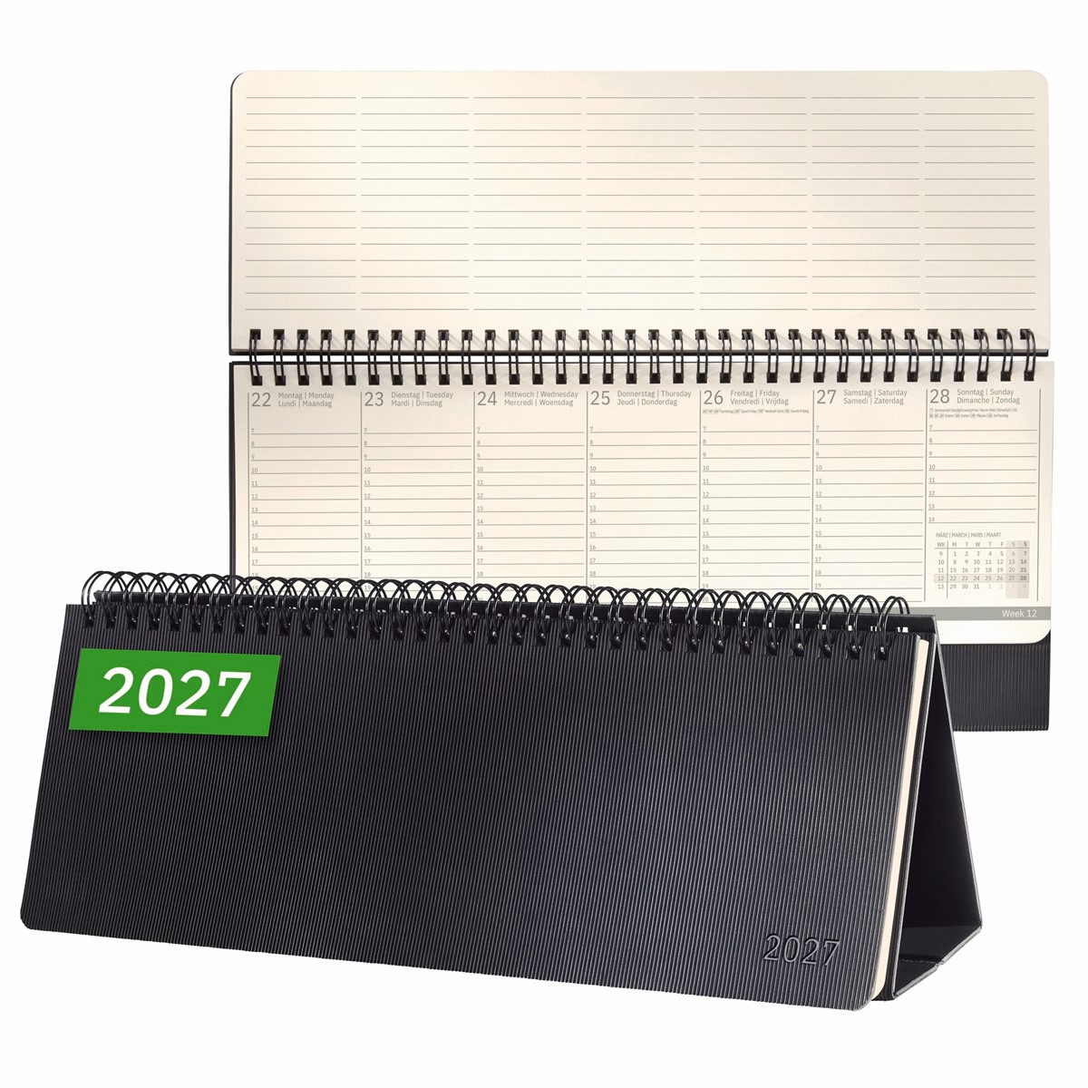 Immer stilsicher organisiert - mit dem Tischkalender für 2027 (Kalendarium: 2 Seiten = unten Woche / oben Notizseite, DE/GB/FR/NL), schwarz, mit 132 Seiten. Die Stundeneinteilung und zusätzliche Notizseiten ermöglichen Ihnen bei dem Wochenkalender im langen Querformat (30 x 14,30 x 1,80 cm) eine präzise Terminplanung.