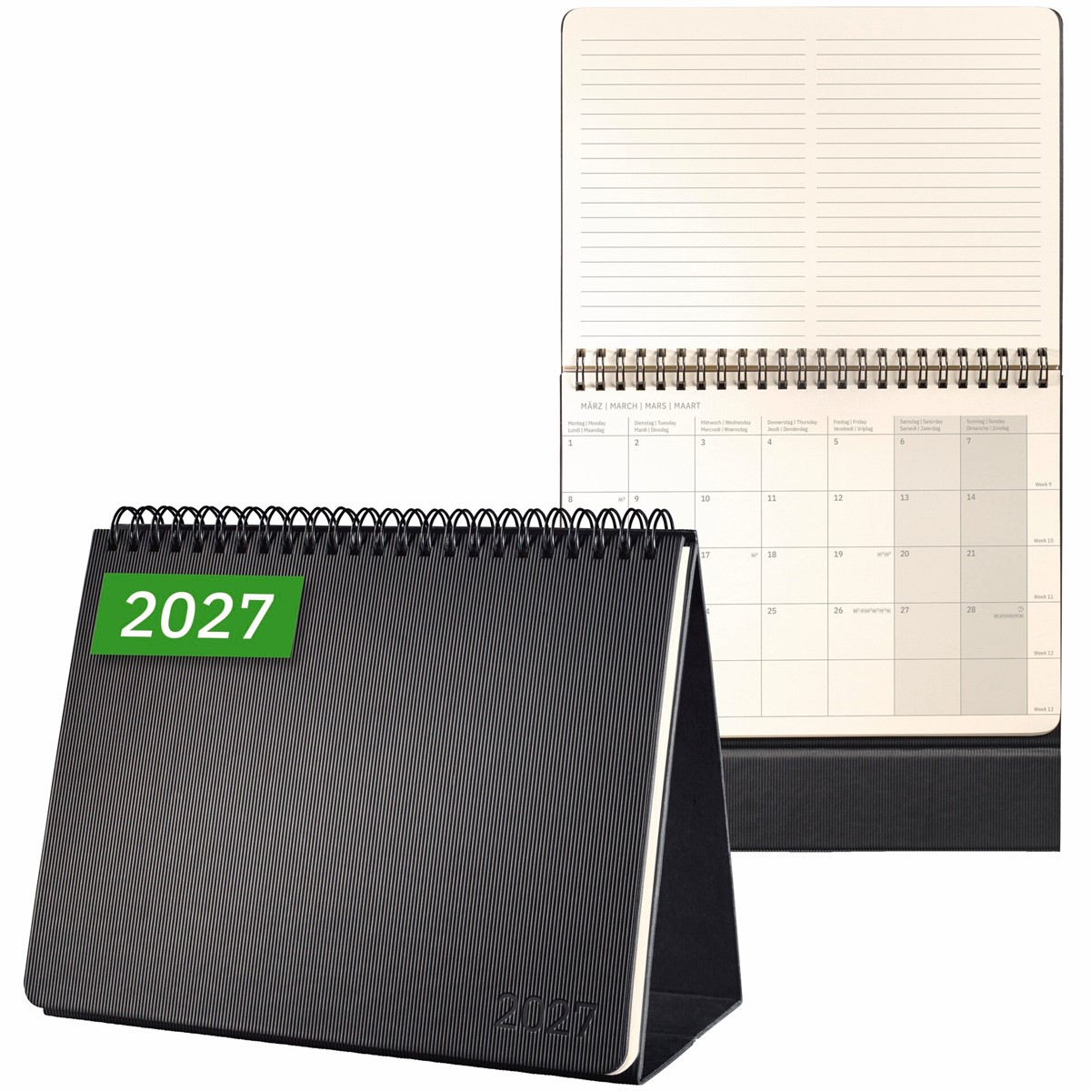 Immer stilsicher organisiert - mit dem Tischkalender für 2027 (Kalendarium: 2 Seiten = unten Monat / oben Notizseite, DE/GB/FR/NL), schwarz, mit 144 Seiten. Zusätzliche Wochenplanungs- und Notizseiten ermöglichen Ihnen bei dem Monatskalender im A5-Querformat (21,30 x 22 x 1,80 cm) eine übersichtliche Terminplanung.