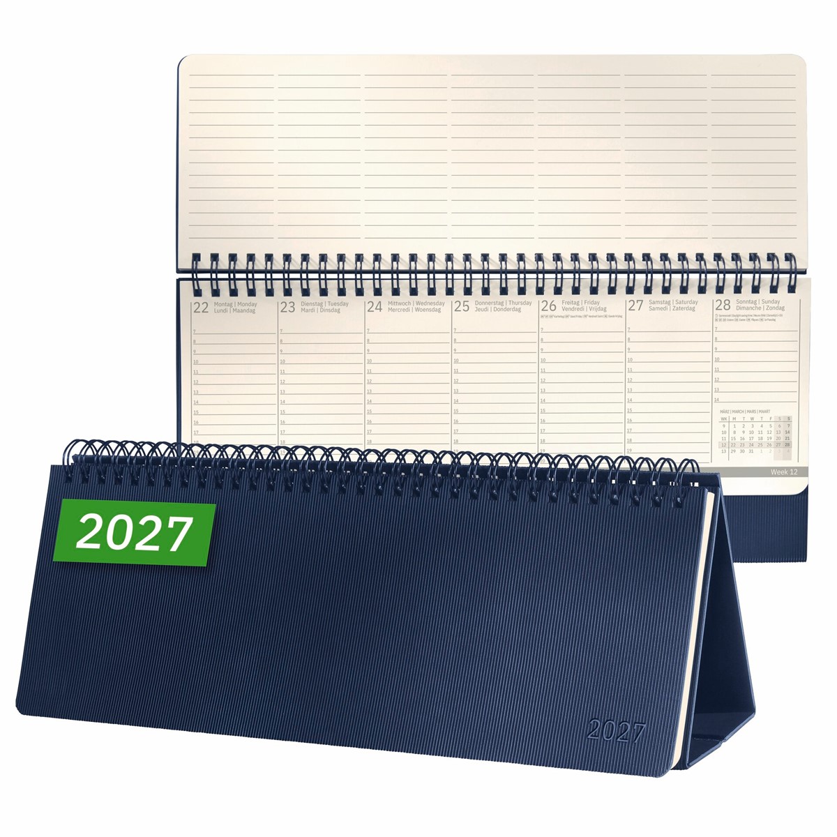 Immer stilsicher organisiert - mit dem Tischkalender für 2027 (Kalendarium: 2 Seiten = unten Woche / oben Notizseite, DE/GB/FR/NL), dunkelblau, mit 132 Seiten. Die Stundeneinteilung und zusätzliche Notizseiten ermöglichen Ihnen bei dem Wochenkalender im langen Querformat (30 x 14,30 x 1,80 cm) eine präzise Terminplanung.