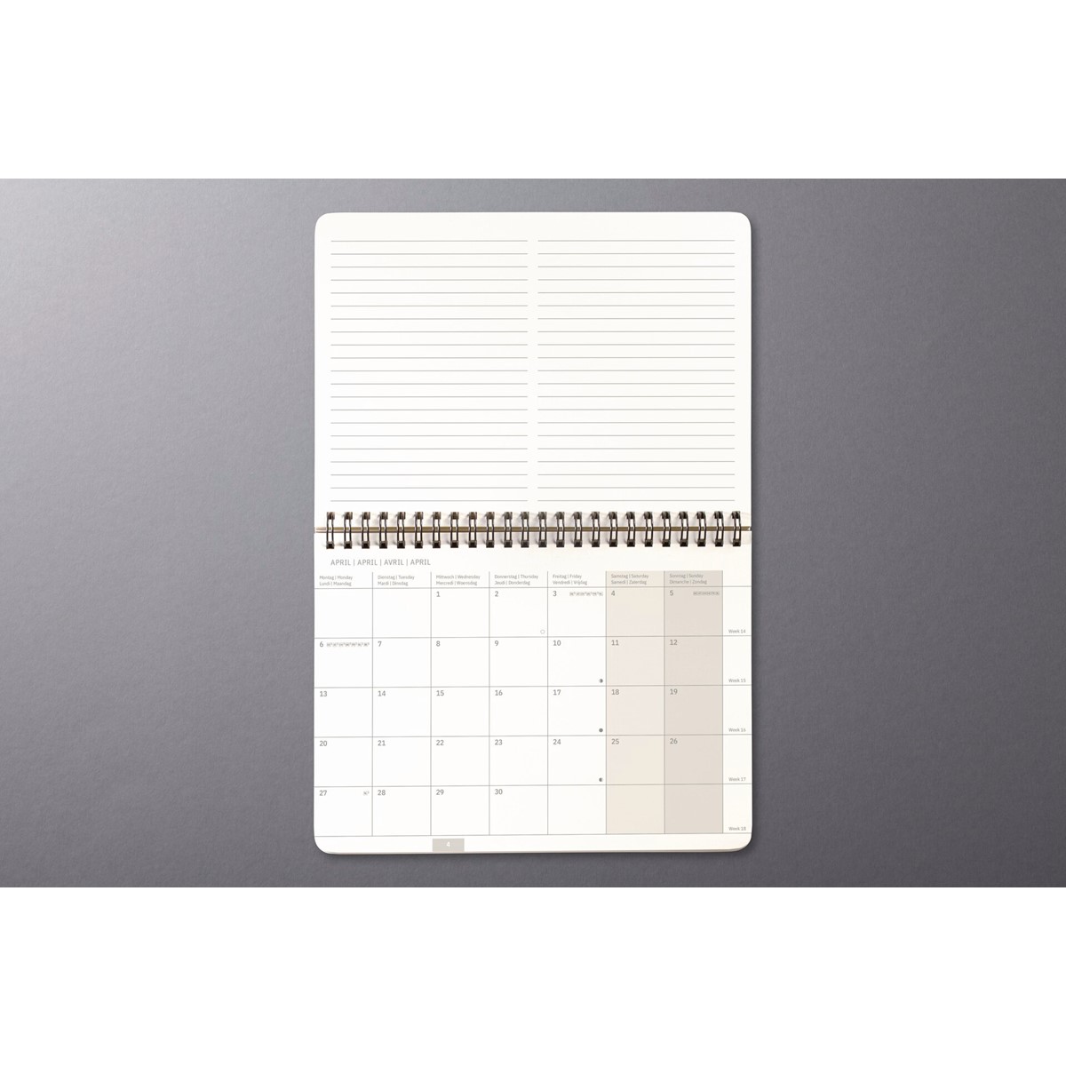 Mit der Ringösenbindung aus Metall lässt sich der Kalender mit seiner praktischen Aufstellfunktion liegend oder stehend einsetzen.