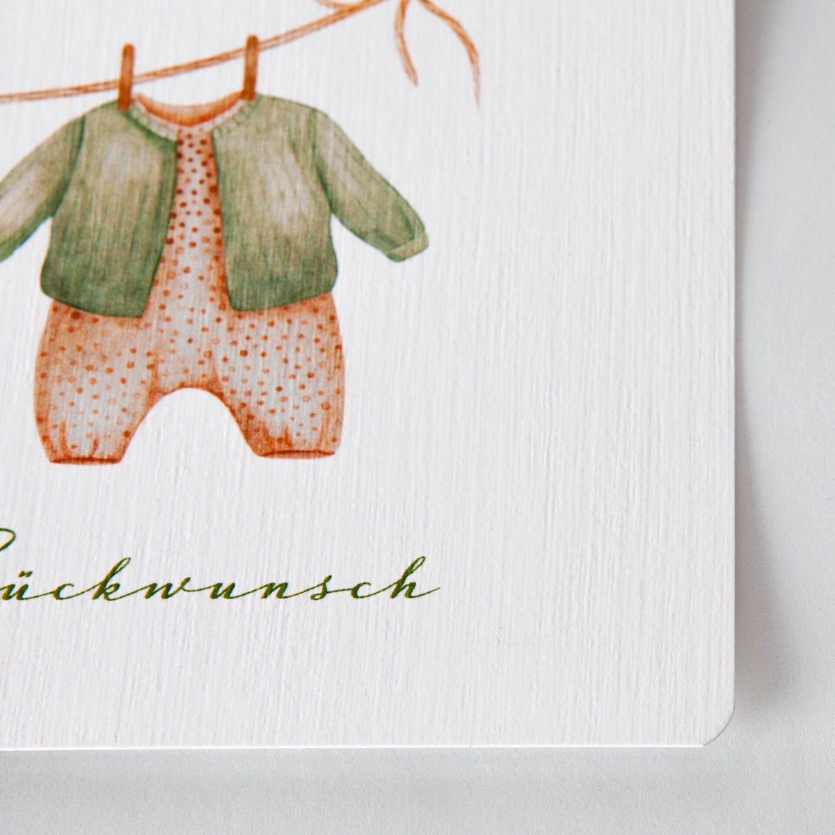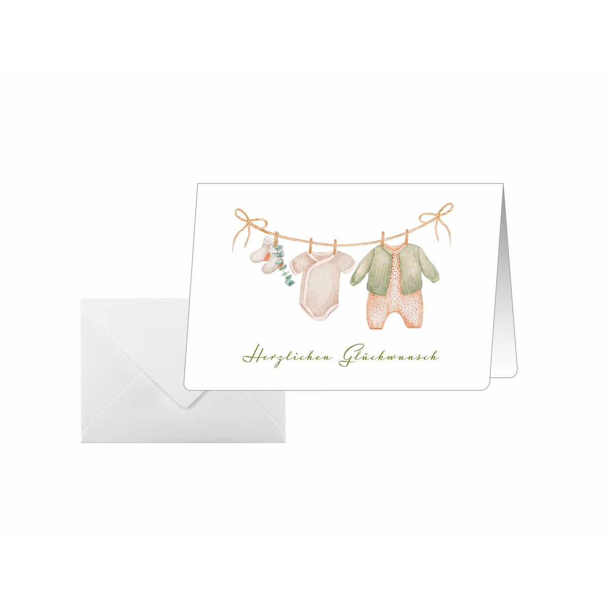 Ruck-zuck bedruckt: Glückwunsch-Karten "Baby Clothes" (Motiv: Wäscheleine in Farbkombination/weiß/beige/grün/braun) im Format C6 (246 g/m², 10 Karten, Karte: Strukturkarton | Umschlag: Weißpapier). Inkl. 10 passender, gummierter Umschläge.