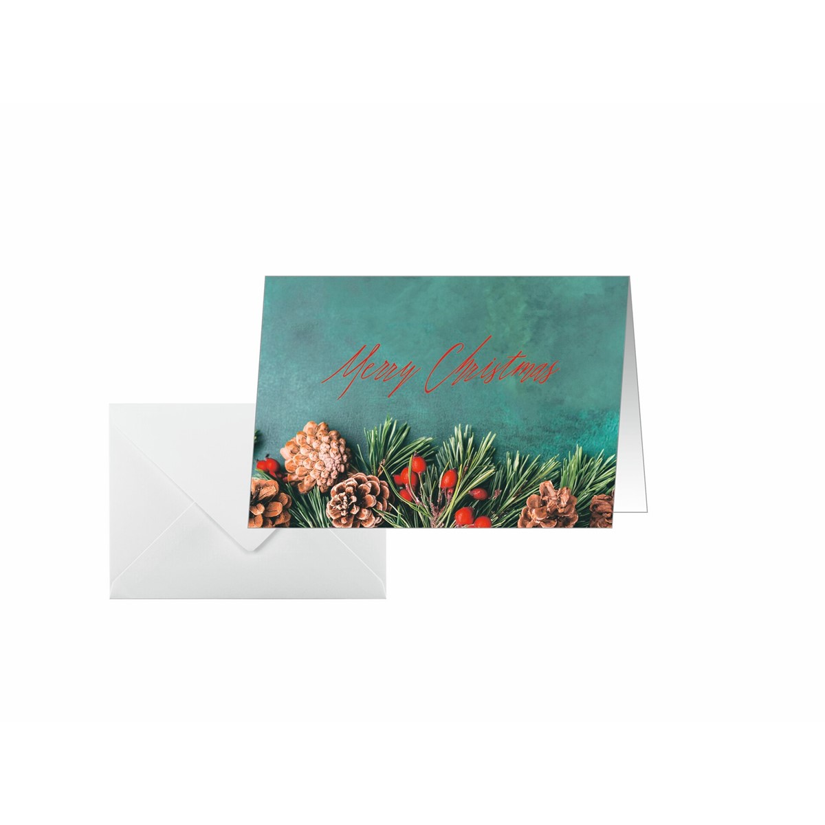 Mit einmaligem Motiv und ruck-zuck bedruckt: Weihnachts-Karten "Green Christmas" (Motiv: Tannenzweige in grün/braun/rot) im Format A6 (250 g/m², 25 Karten, Karte: Weißkarton - Umschlag: Weißpapier).