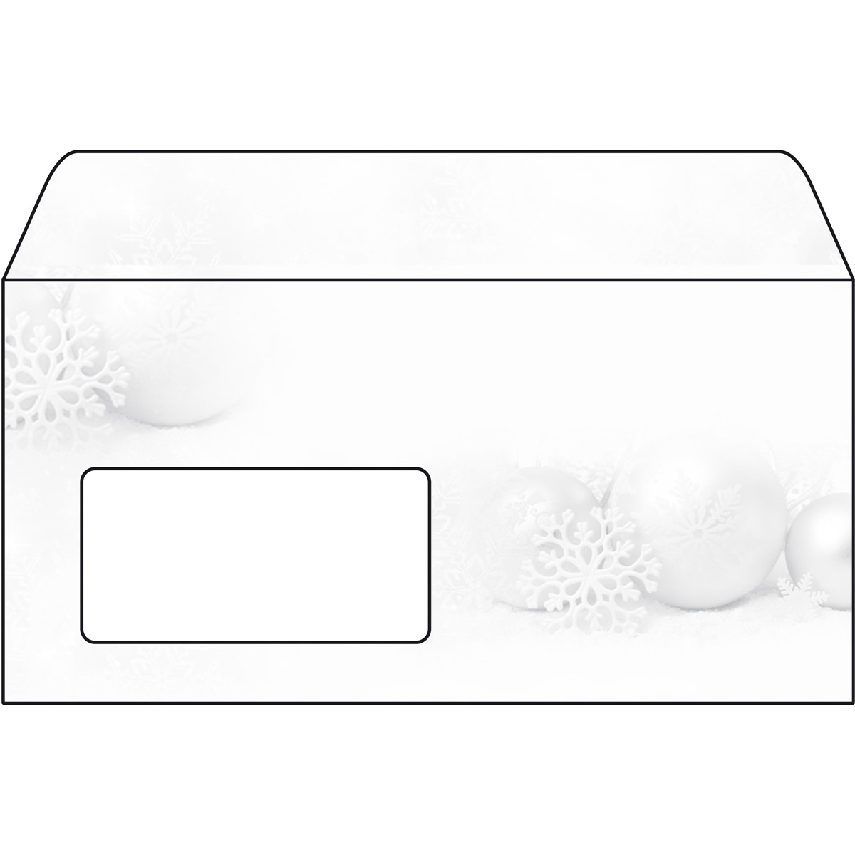 Weihnachts-Umschlag "Winter Sparkle" mit mit silbernen Weihnachtskugeln und weißen Eiskristallen als Motiv passend zum Weihnachts-Motiv-Papier DP089. Die Fensterumschläge sind gummiert. Im Lieferumfang sind 50 Stück im Format DIN lang enthalten.