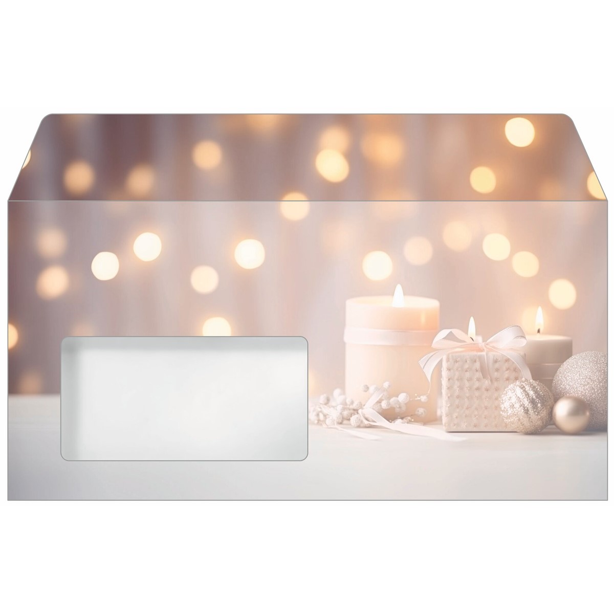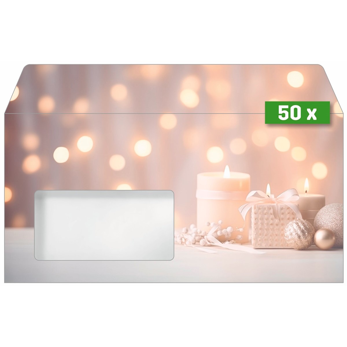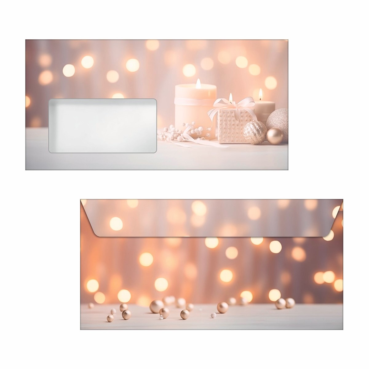 Stilvolle Weihnachtsumschläge "Golden Glow" (Motiv: Kerzen in gold/beige/champagne) im Format DIN lang, 50 Stück mit gummierter Klappe.