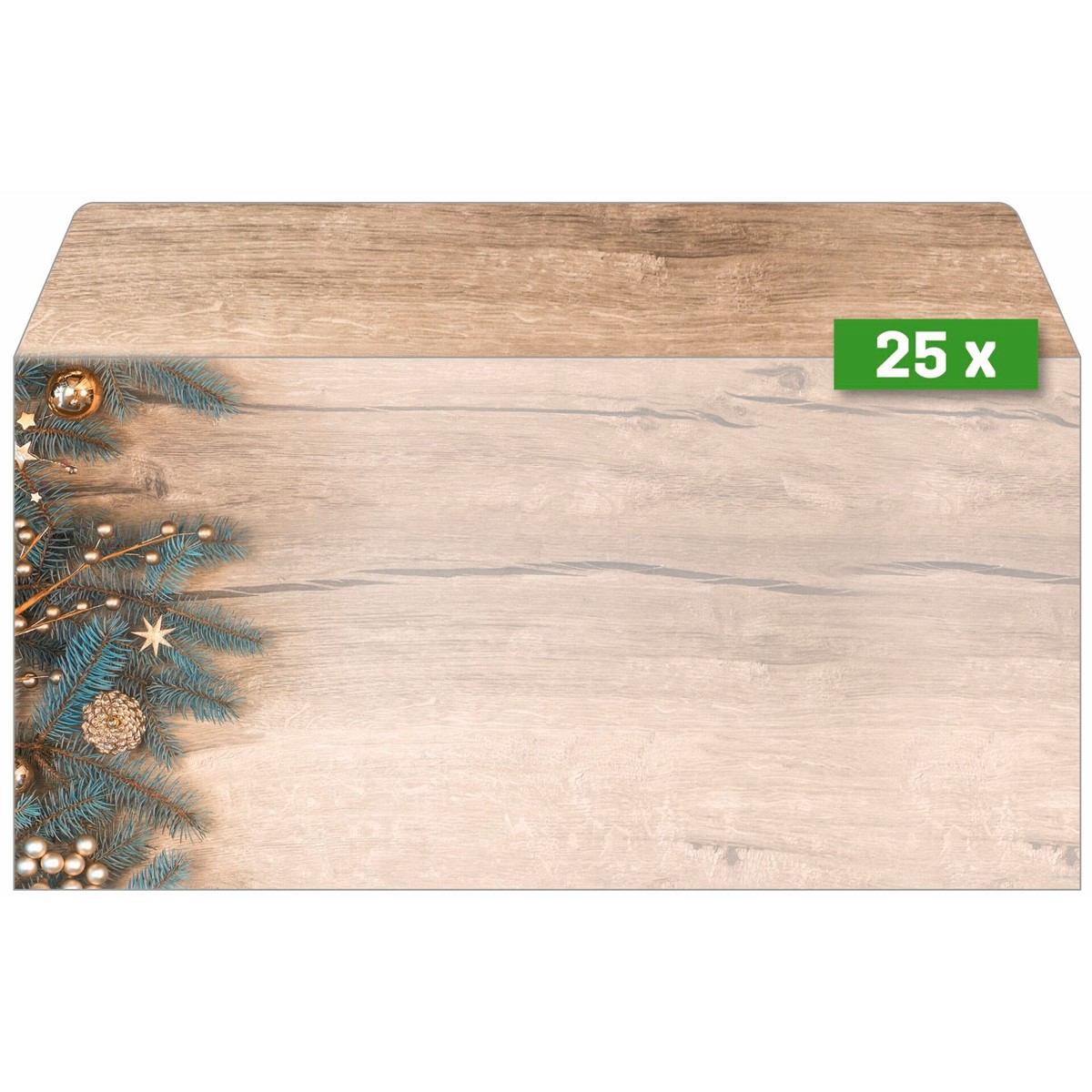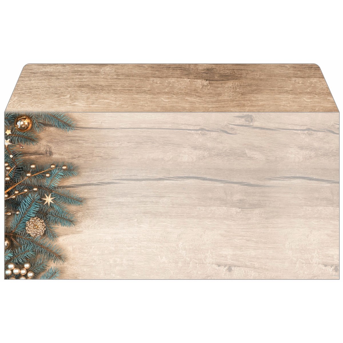 Stilvolle Weihnachtsumschläge "Golden Greens" (Motiv: Tannenzweige in braun/gold/grün) im Format DIN lang, 25 Stück mit gummierter Klappe.