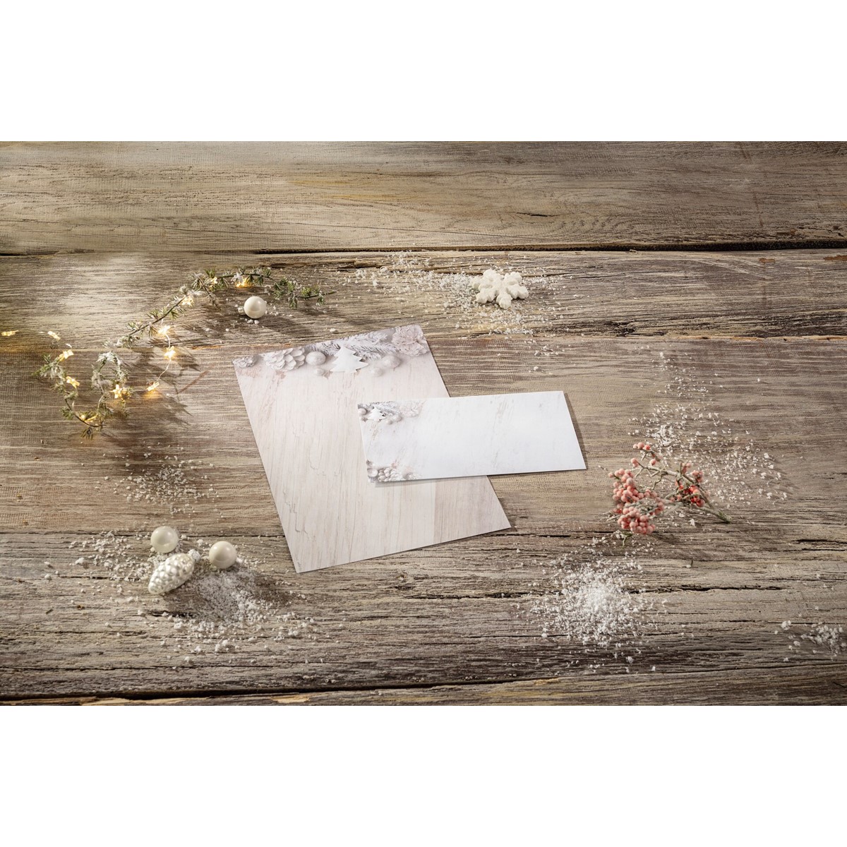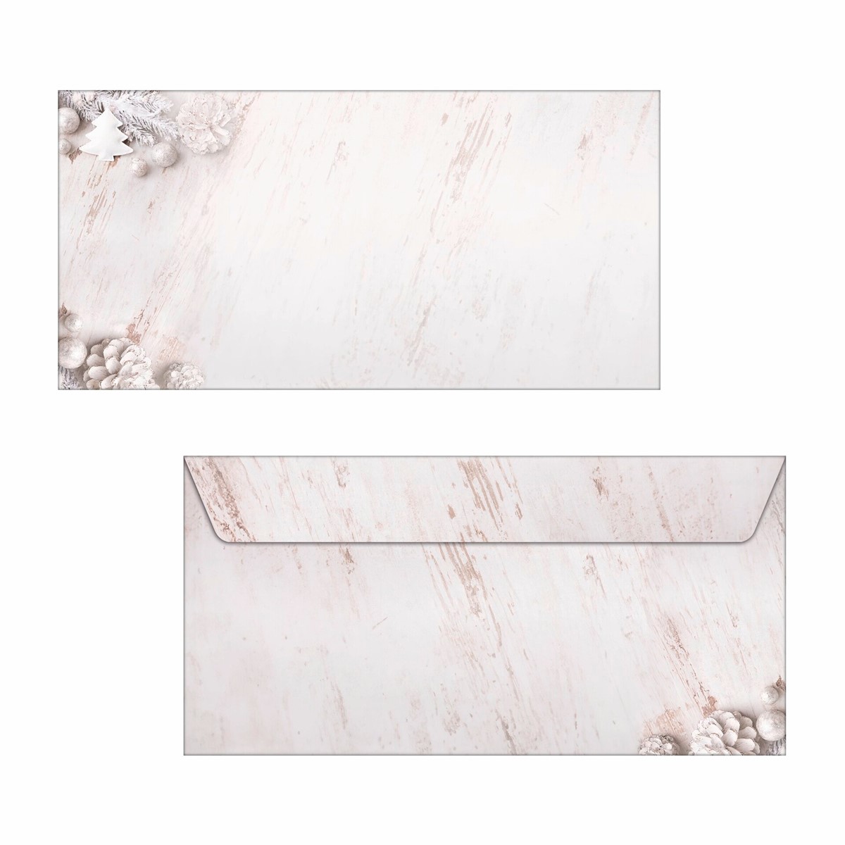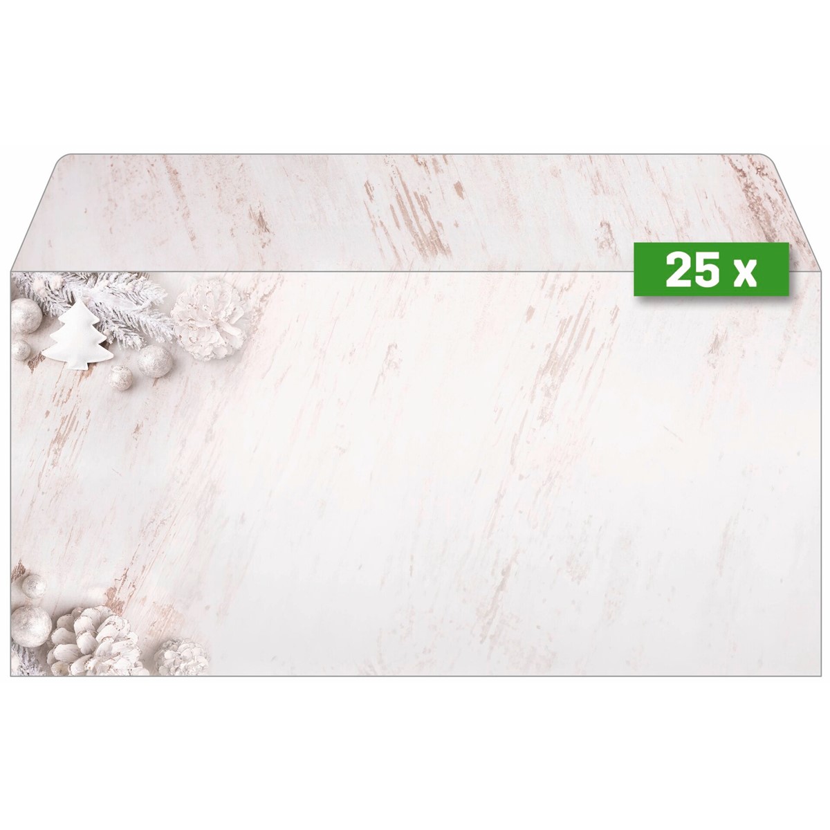 Stilvolle Weihnachtsumschläge "Rustic White" (Motiv: Tannenzapfen in beige/weiß) im Format DIN lang, 25 Stück mit gummierter Klappe.