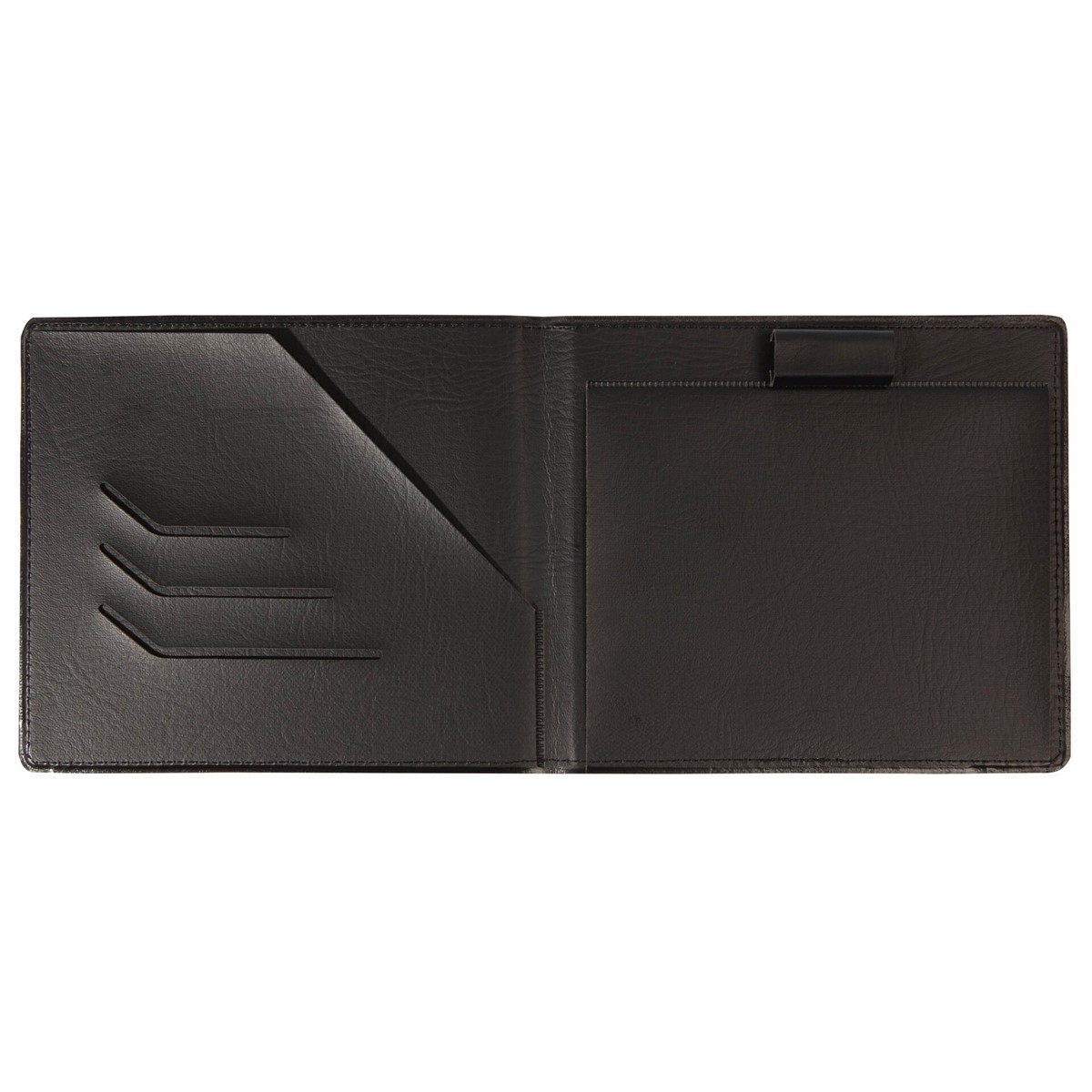 Schutzhülle in ansprechender Lederoptik, mit praktischen Einstecktaschen für Belege oder Notizzettel und integriertem Stiftehalter.