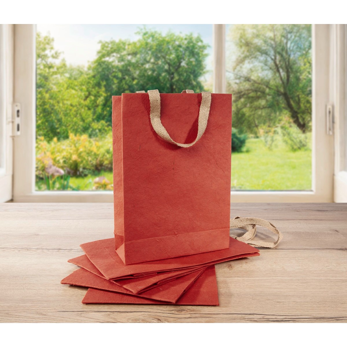 Geschenktasche large "Red Coco" aus Jutefaserpapier mit Kokosfasermusterung im Format 25 x 35,50 x 10 cm in rot.