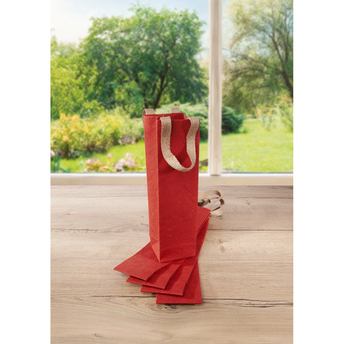 Geschenktasche Flasche "Red Coco" aus Jutefaserpapier mit Kokosfasermusterung im Format 10 x 35,50 x 8 cm in rot.
