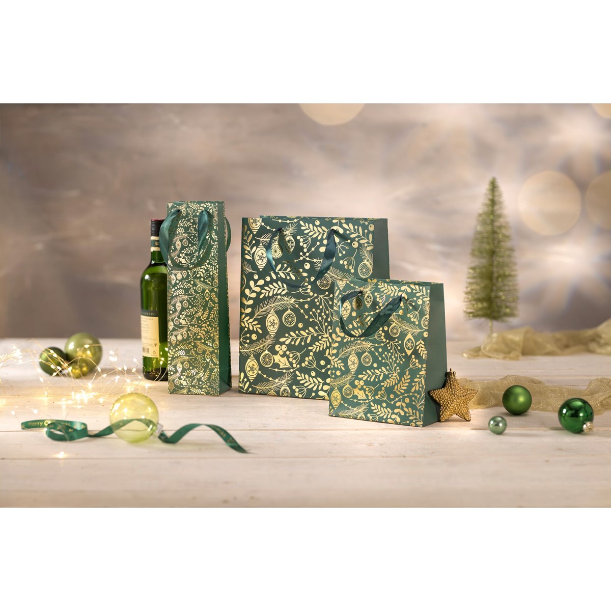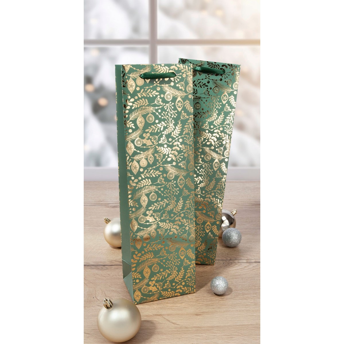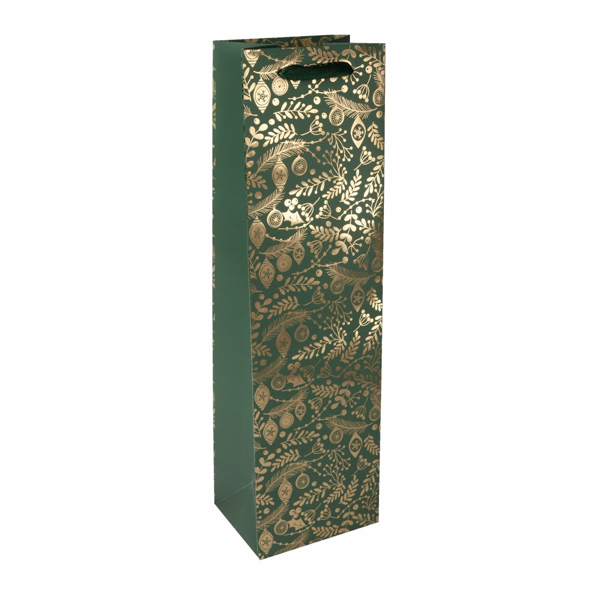 • Geschenktasche Flasche "Golden ornaments on green" aus Papier matt mit Glanzfolie im Format 10 x 35 x 8 cm in gold/grün.