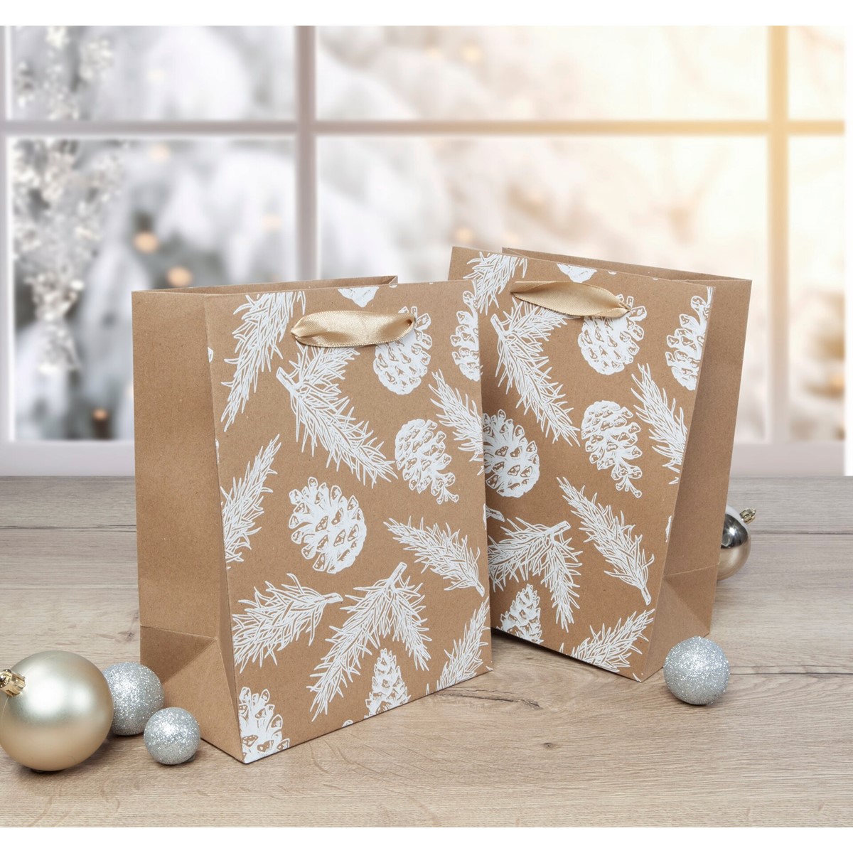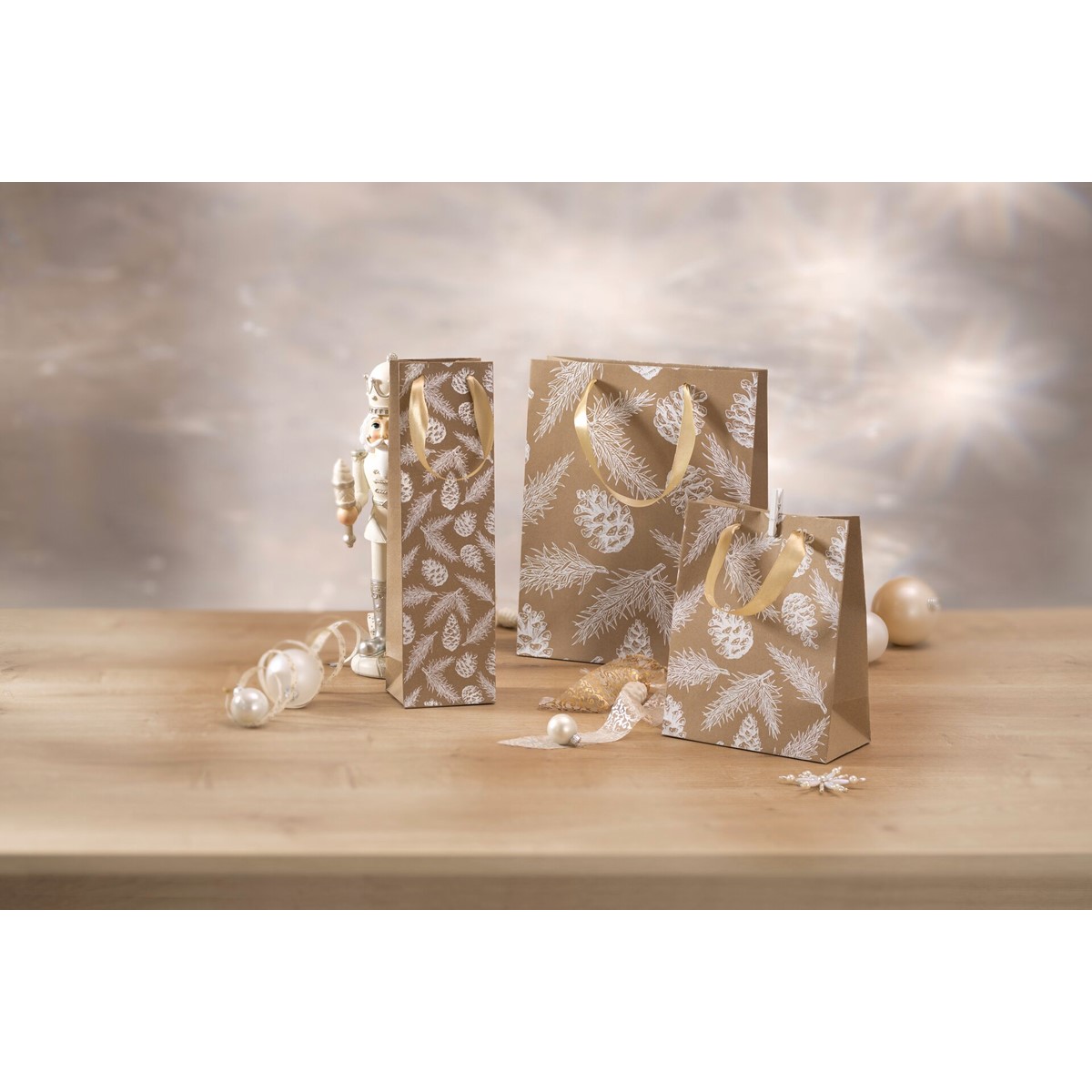 Geschenktasche small "Pine cones and pine branches" aus Papier matt mit UV-Lack-Druck im Format 18 x 23 x 10 cm in braun/weiß.