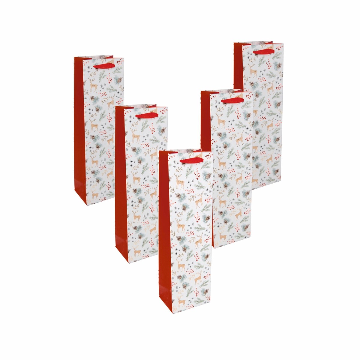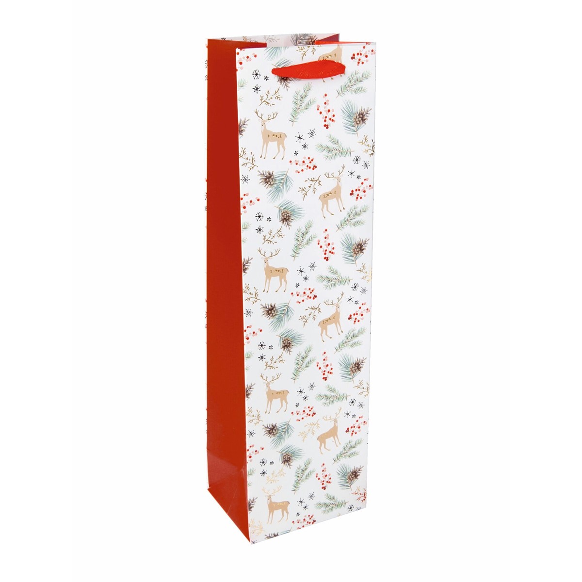 Geschenktasche Flasche "Christmas motifs watercolor" aus Papier matt mit Glanzfolie im Format 10 x 35 x 8 cm in weiß/gold/rot.