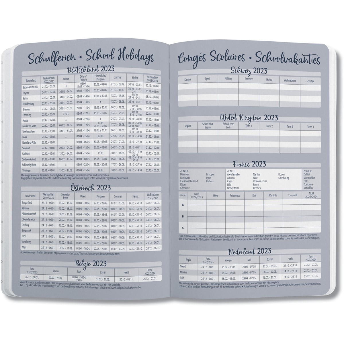• Zahlreiche Info-, Motiv- und Planungsseiten: Monats- und Jahresübersichten, Ferien und Feiertage (DE/AT/CH/UK/FR/BE/NL), Maßtabelle, Reiseziele, Geburtstage u. v. m.