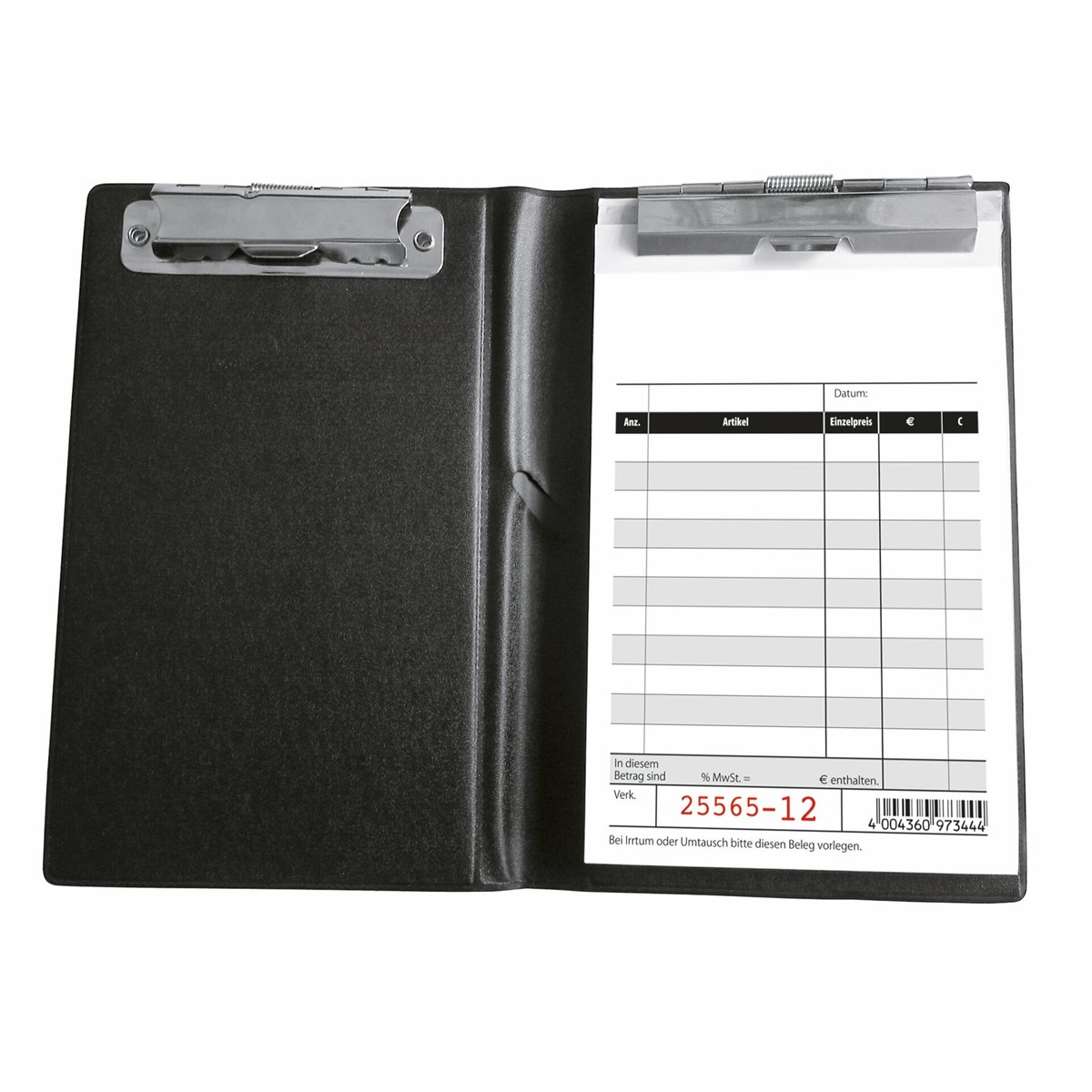 Kassenblockmappe zur sicheren und sauberen Aufbewahrung von Kassenblocks im Format bis ca. 100 x 165 mm. Mit integriertem Stifthalter und zusätzlicher Metallklemme zur Abheftung des Additionsblattes.