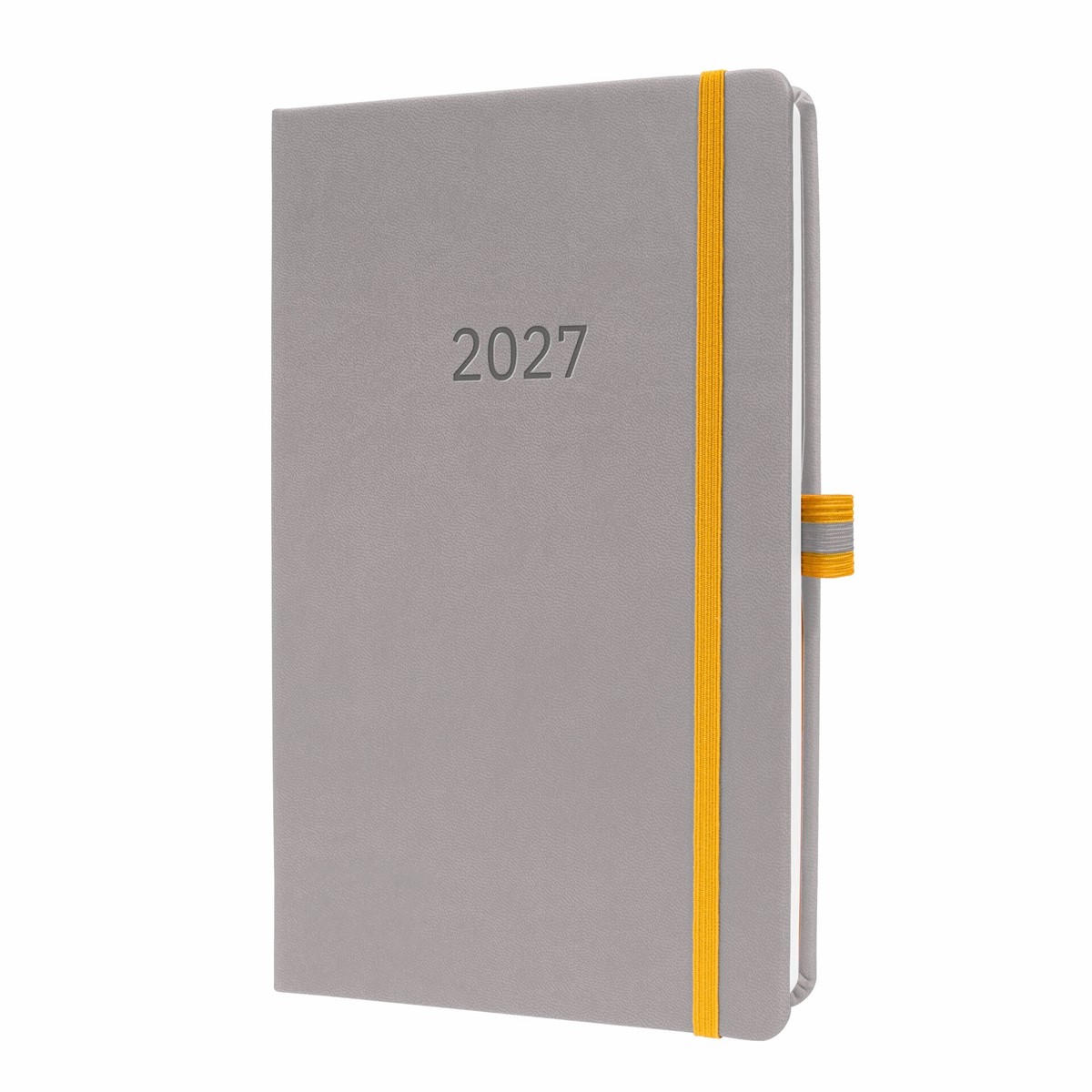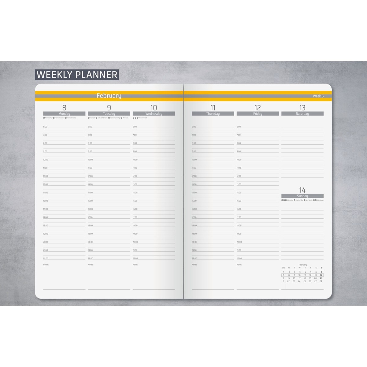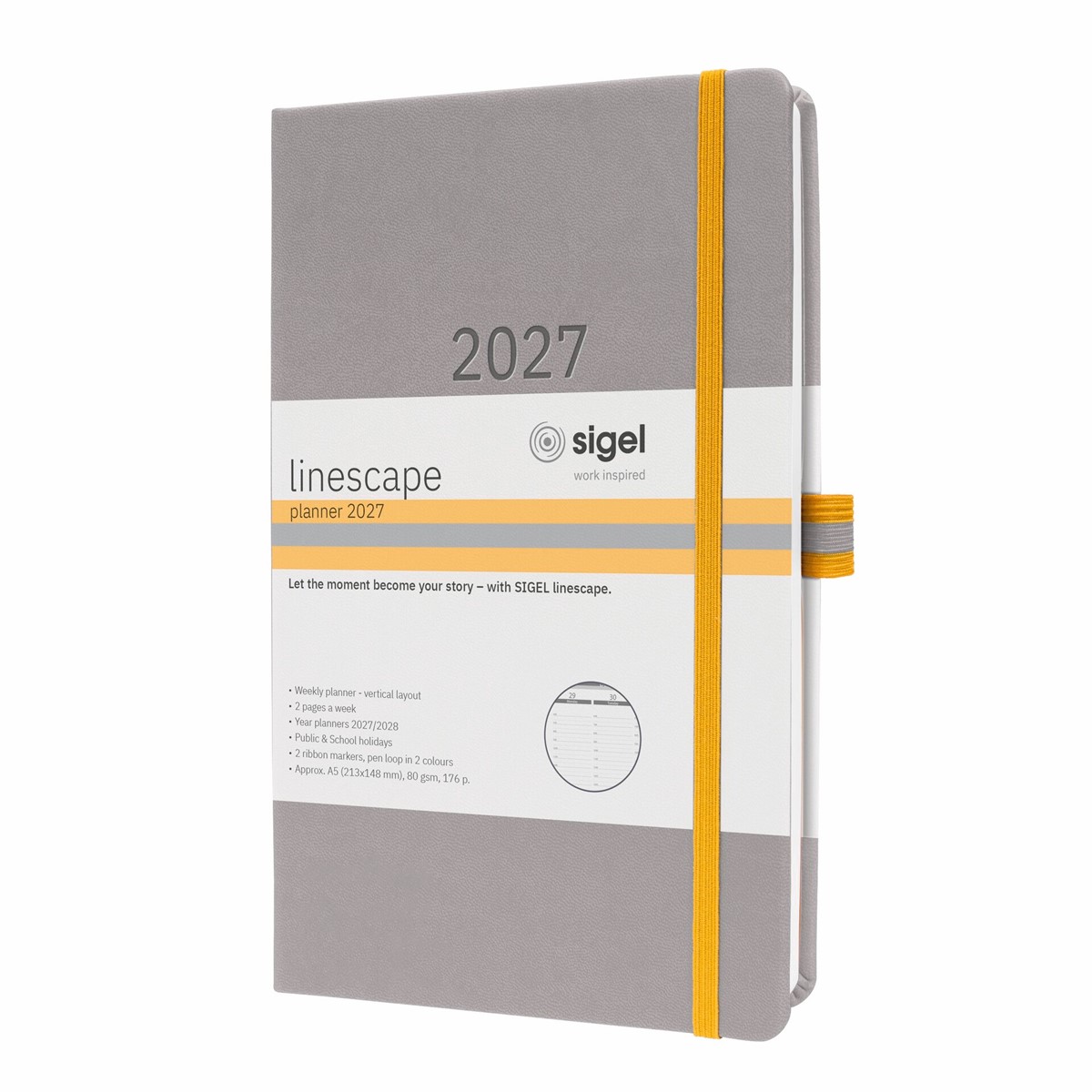 Ihr Begleiter durch das Jahr: Wochenkalender Linescape in hellgrau/gelb für 2027 (Kalendarium: 2 Seiten = 1 Woche, vertikales Layout, EN) im Format ca. A5 (14,80 x 21,30 x 1,60 cm) mit 176 Seiten.