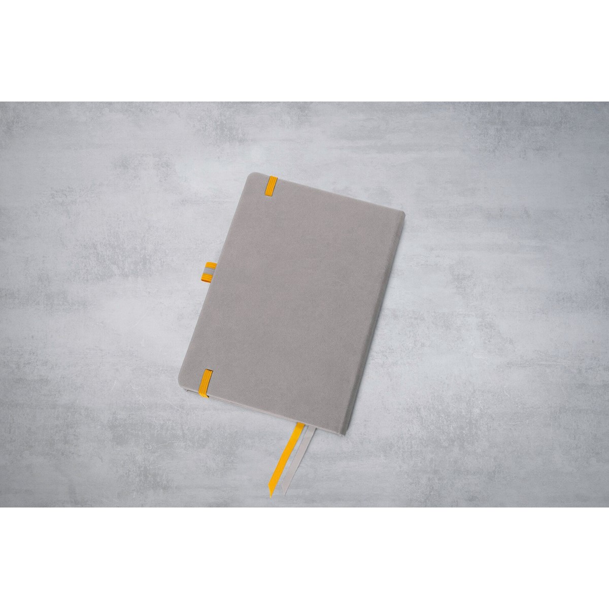 Das Cover aus weichem PU kommt dabei dezent, allerdings besticht die Akzentfarbe Gelb bei den Features: Gummiband, Zeichenbänder, die 2-farbige Stiftschlaufe und die Vorsatzseiten greifen den Gelbton wieder auf.