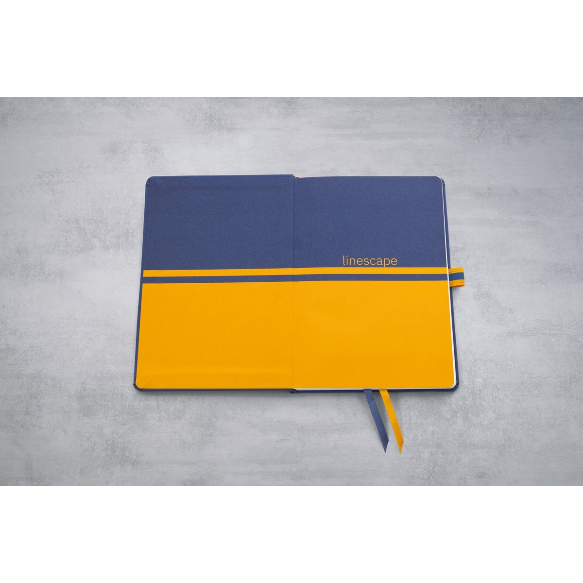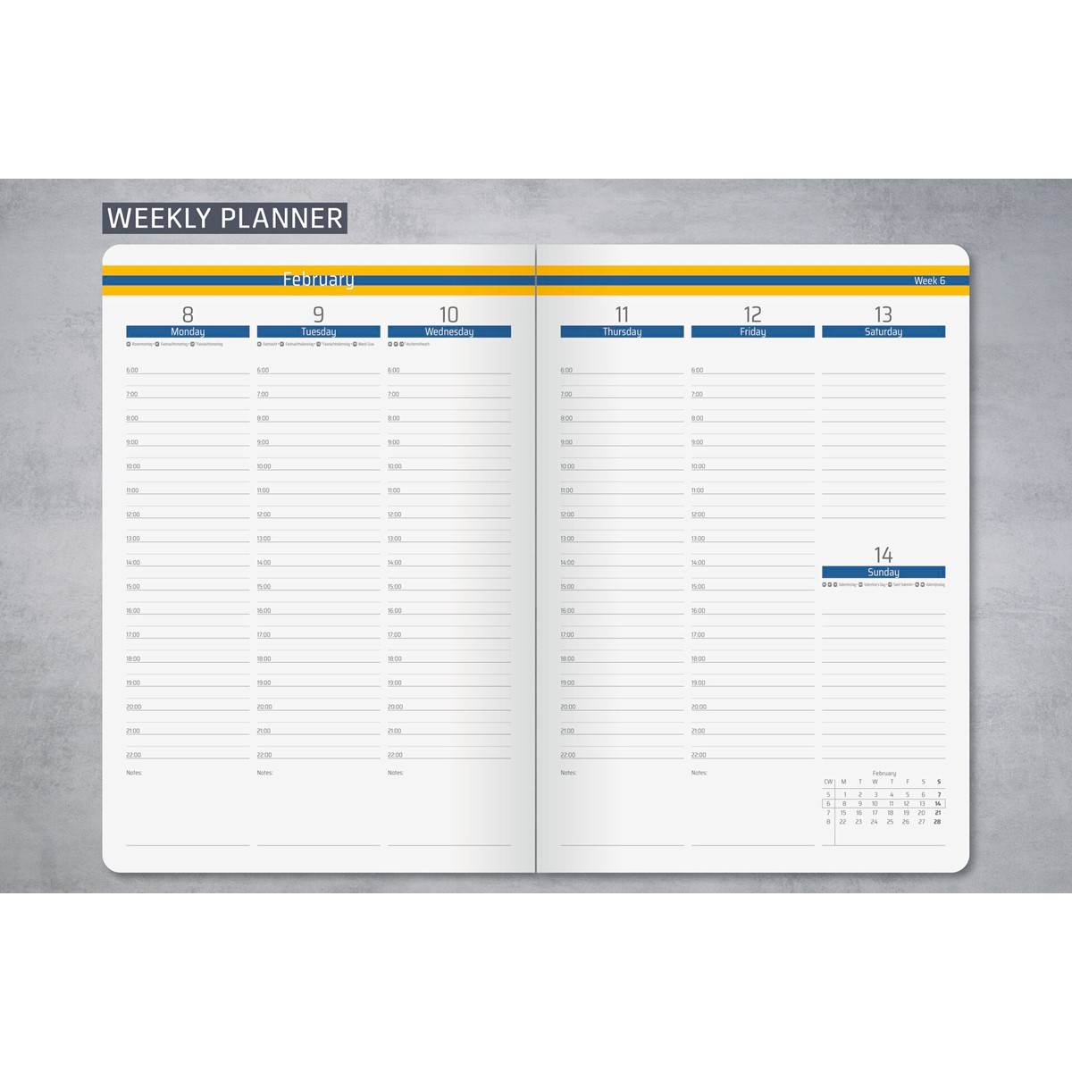 Ihr Begleiter durch das Jahr: Wochenkalender Linescape in blau/gelb für 2027 (Kalendarium: 2 Seiten = 1 Woche, vertikales Layout, EN) im Format ca. A5 (14,80 x 21,30 x 1,60 cm) mit 176 Seiten.