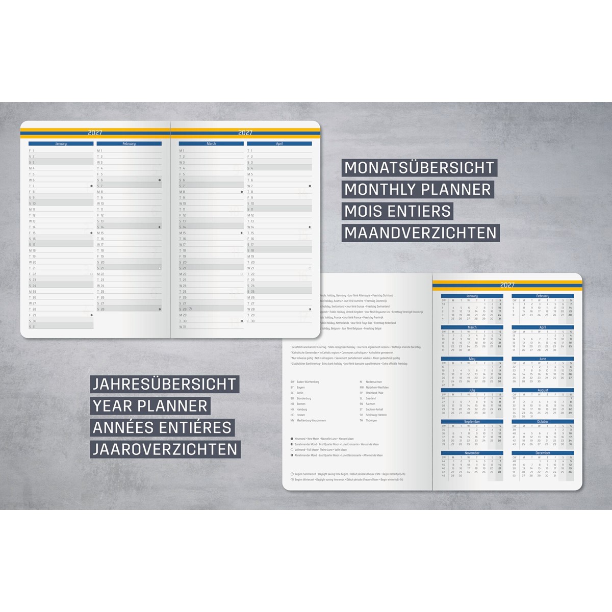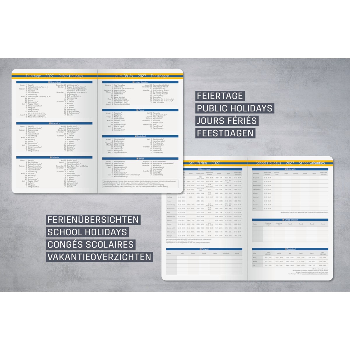 Auf 176 Seiten (FSC-zertifiziert) finden sich Wochenkalender im vertikalen Layout, Jahres- und Monatsübersichten, Feiertage und Schulferien sowie linierte Notizseiten.