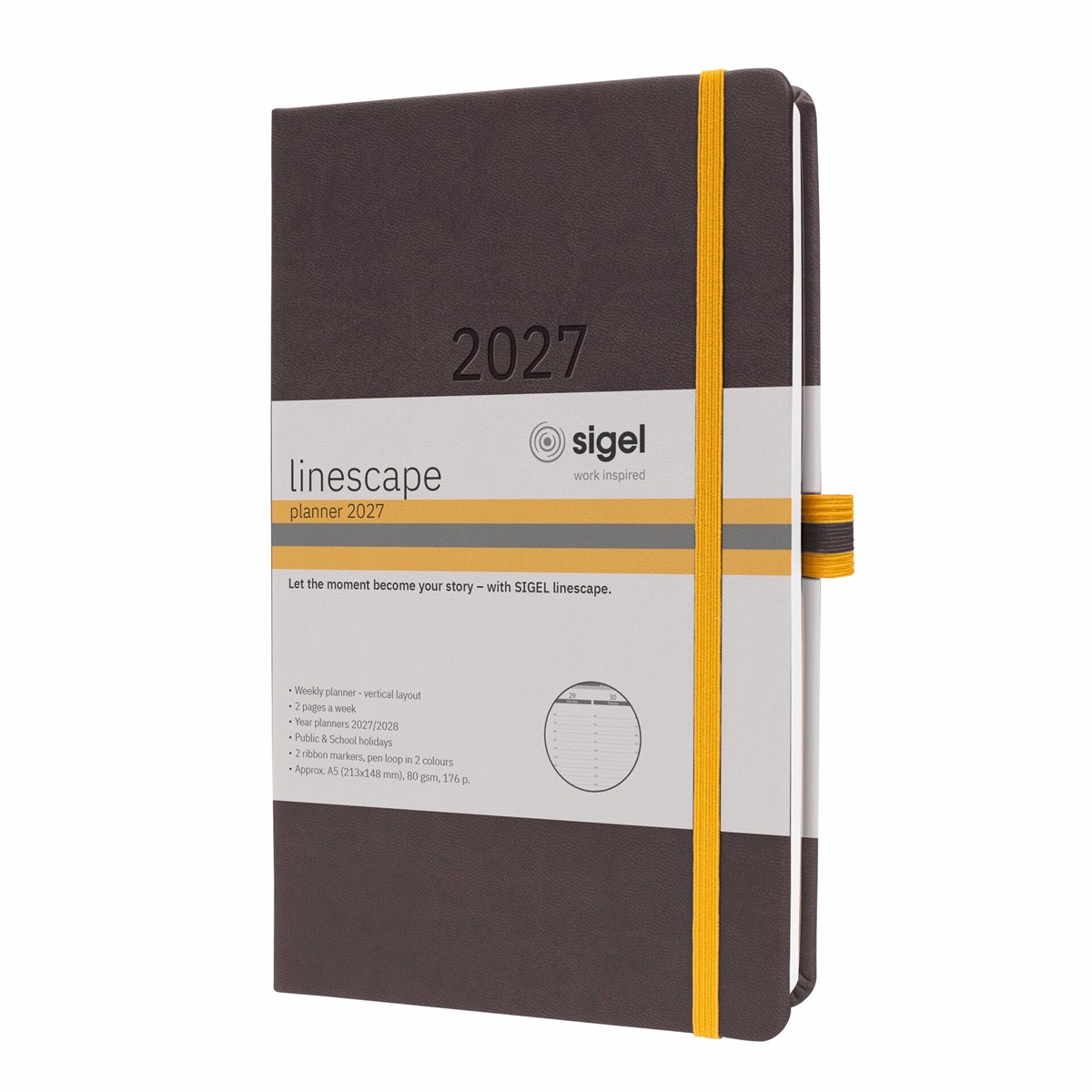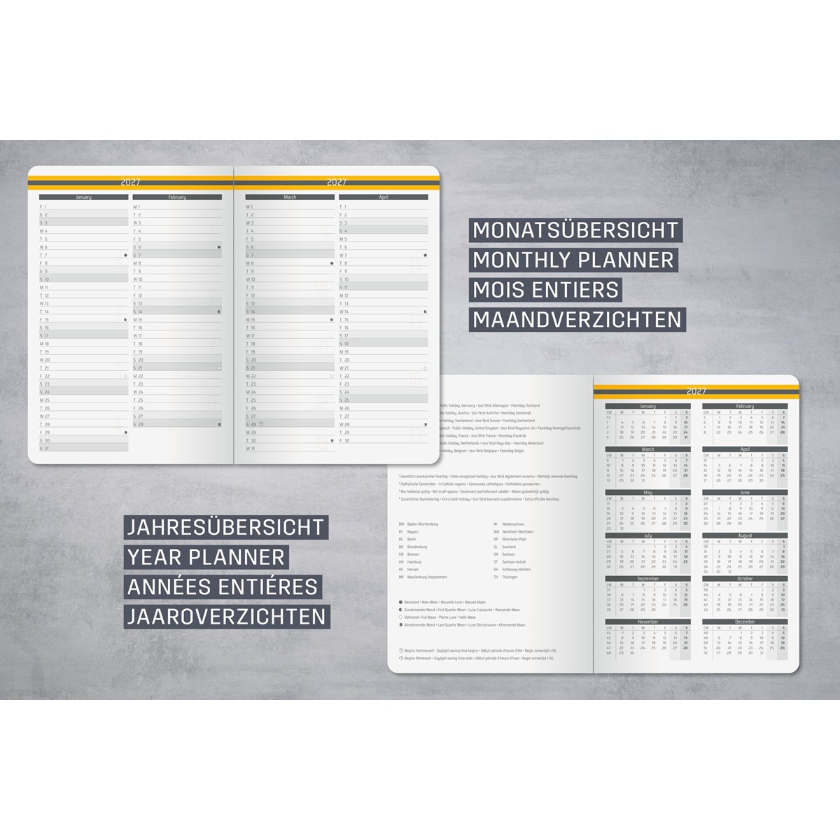 Ihr Begleiter durch das Jahr: Wochenkalender Linescape in dunkelgrau/gelb für 2027 (Kalendarium: 2 Seiten = 1 Woche, vertikales Layout, EN) im Format ca. A5 (14,80 x 21,30 x 1,60 cm) mit 176 Seiten.