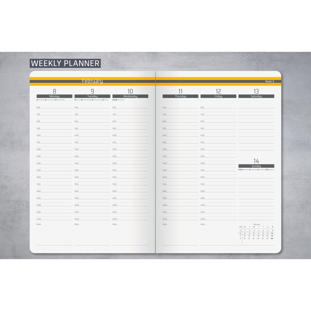 Auf 176 Seiten (FSC-zertifiziert) finden sich Wochenkalender im vertikalen Layout, Jahres- und Monatsübersichten, Feiertage und Schulferien sowie linierte Notizseiten.