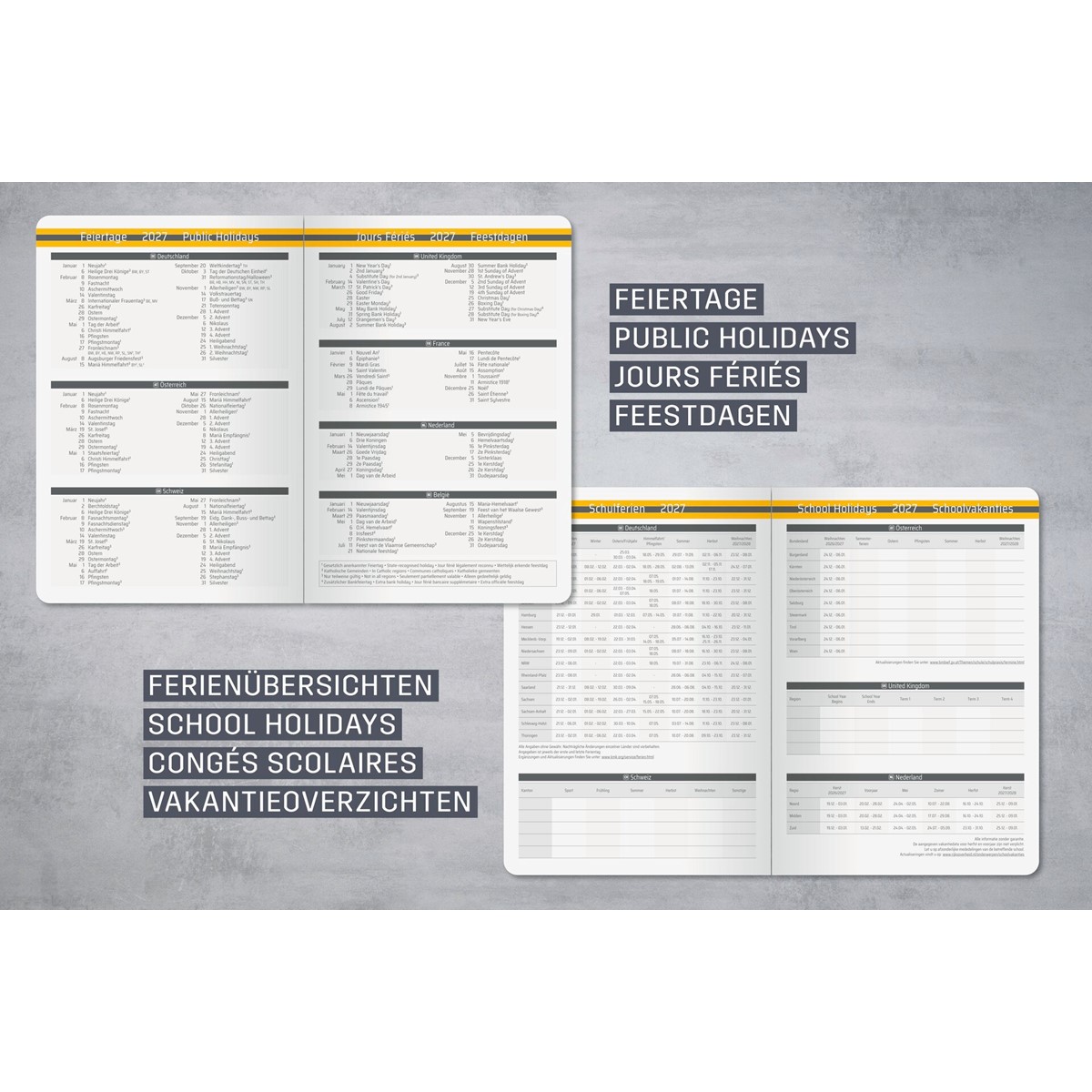 Übersichten: Monats- und Jahresübersichten, Feiertage & Schulferien (DE/AT/CH/UK/FR/BE/NL), linierte Notizseiten