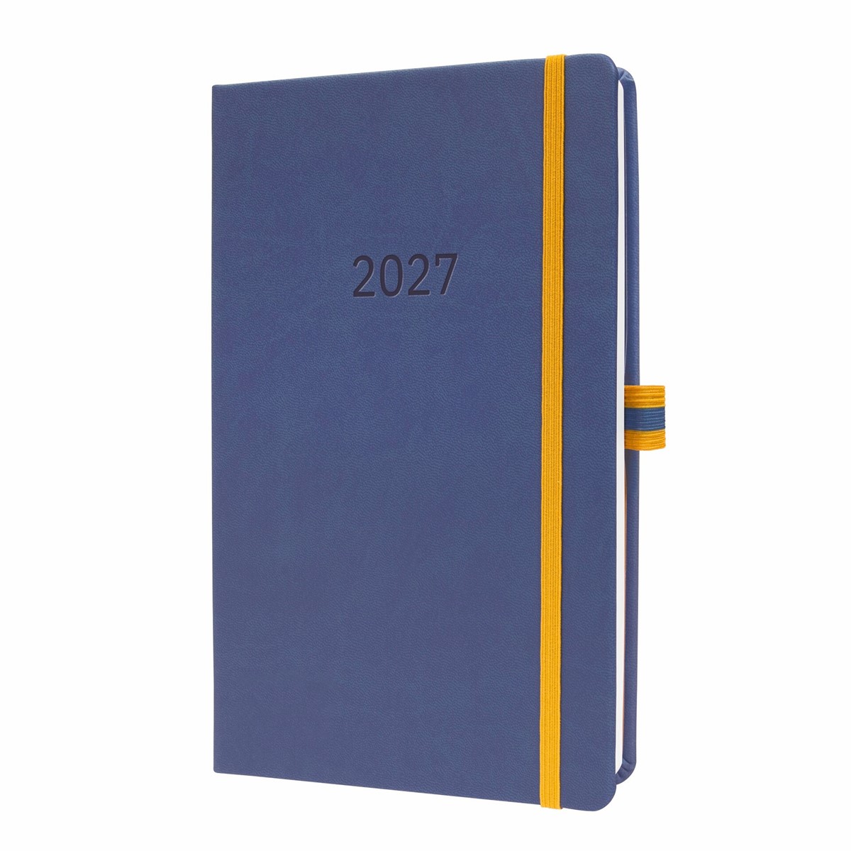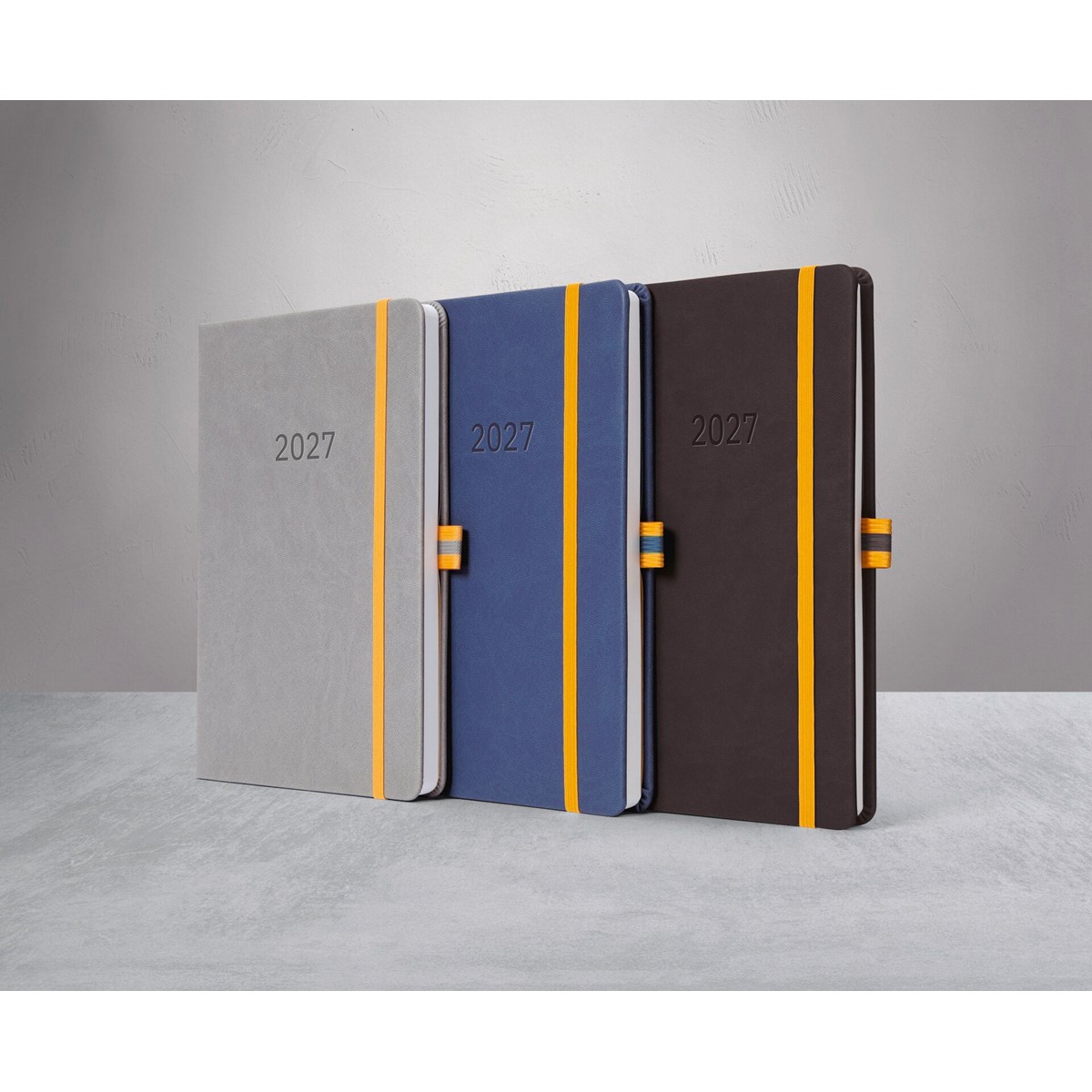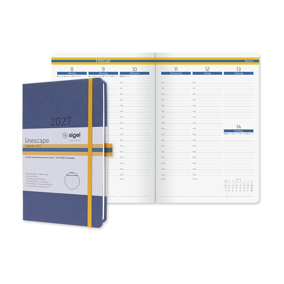 Ihr Begleiter durch das Jahr: Wochenkalender Linescape in blau/gelb für 2027 (Kalendarium: 2 Seiten = 1 Woche, vertikales Layout, DE) im Format ca. A5 (14,80 x 21,30 x 1,60 cm) mit 176 Seiten.
