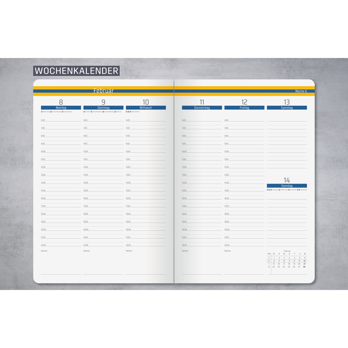 Auf 176 Seiten (FSC-zertifiziert) finden sich Wochenkalender im vertikalen Layout, Jahres- und Monatsübersichten, Feiertage und Schulferien sowie linierte Notizseiten.