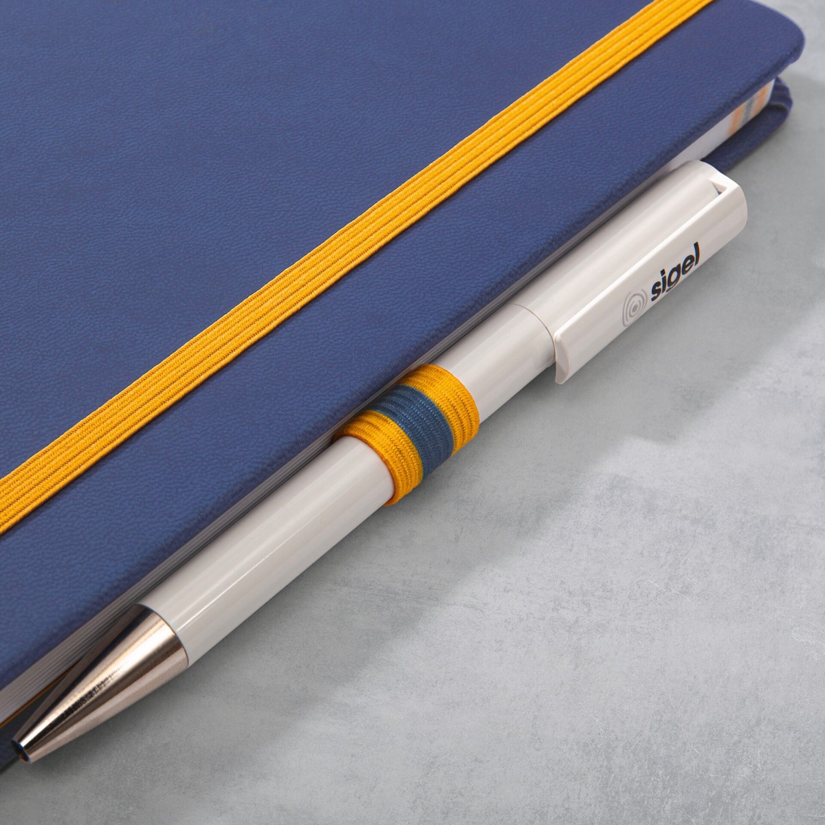 Viele Features: Gummibandverschluss, 2-farbige Stiftschlaufe, 2 Zeichenbänder