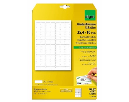 Die weißen wiederablösbaren Etiketten mit abgerundeten Ecken im Format 25,4x10 mm sind hervorragend geeignet für den zeitlich befristeten Einsatz oder für wechselnde Kennzeichnungen. Die Etiketten sind für alle Inkjet- und Laser-Drucker sowie Kopierer geeignet und sorgen für ein klares Druckbild und optimale Geräteschonung dank 4-seitiger Sicherheitskante. Sichere Haftung auf allen glatten Oberflächen und trotzdem rückstandsfrei wiederablösbar. Im Lieferumfang sind 25 Blatt A4 bzw. 4725 Etiketten enthalten.