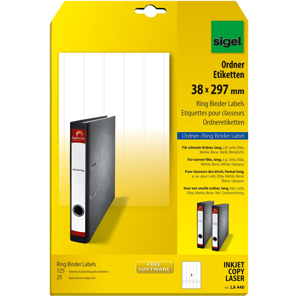 SIGEL Etiketten garantieren höchste Sicherheit während des kompletten Verarbeitungsprozess und eine optimale Geräteschonung dank 4-seitiger Sicherheitskante. Sie können die Etiketten problemlos mit allen gängigen Inkjet-, Laser-Druckern und Kopierern bedrucken. Egal ob breiter oder schmaler Ordner, ob langes oder kurzes Etikett – bei Sigel finden Sie für jeden Ordner genau das Richtige und schaffen schnell und einfach Ordnung in Ihrem Archiv. Beschriftungsmöglichkeiten: